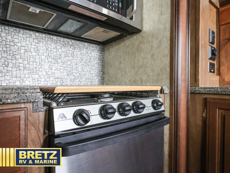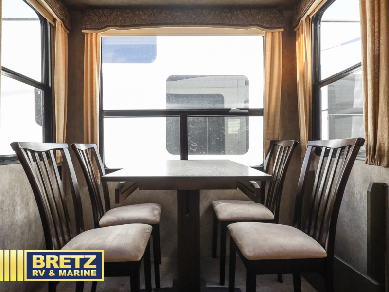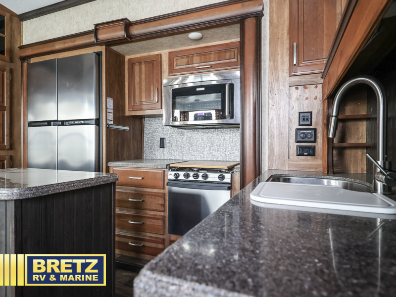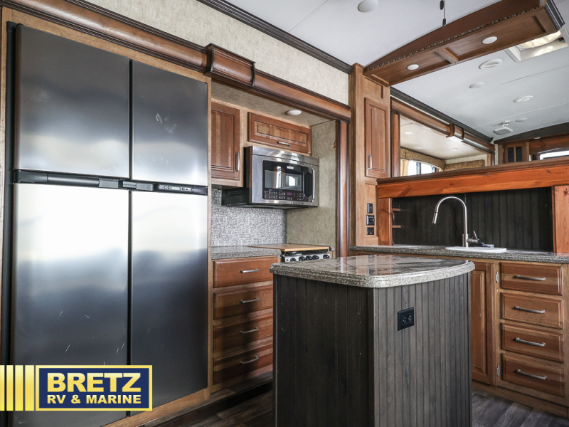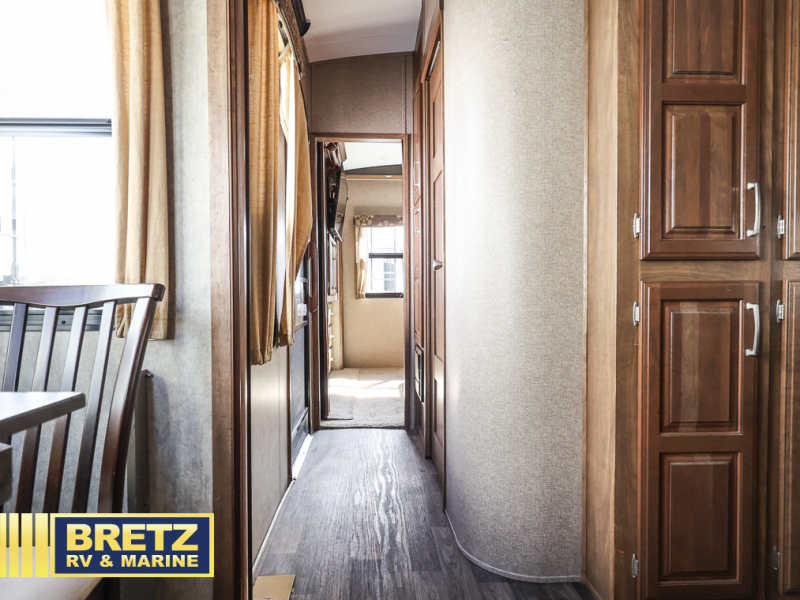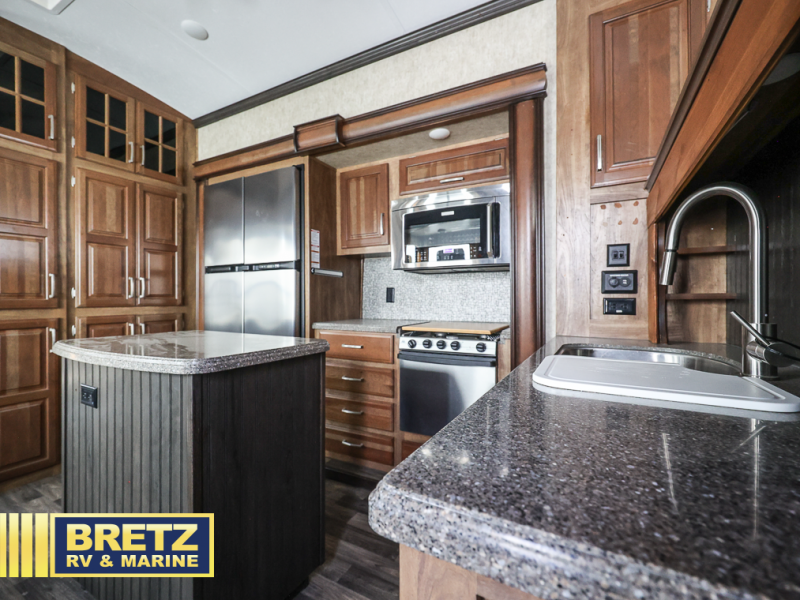 Step inside the centrally located entry door and find yourself in this 3710FL kitchen with dual opposing slides. There is a slide out for the dining table with four chairs to the left of the door. Straight ahead is a counter with double sink, and the slide opposite the door offers a three burner range, counter area, and refrigerator with double doors. There is a small pantry just off the appliance slide, and a space prepped for a washer and dryer if you choose to add. You will also enjoy the convenient kitchen island which provides added food prep space and more.