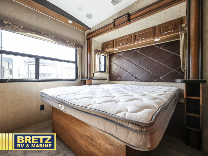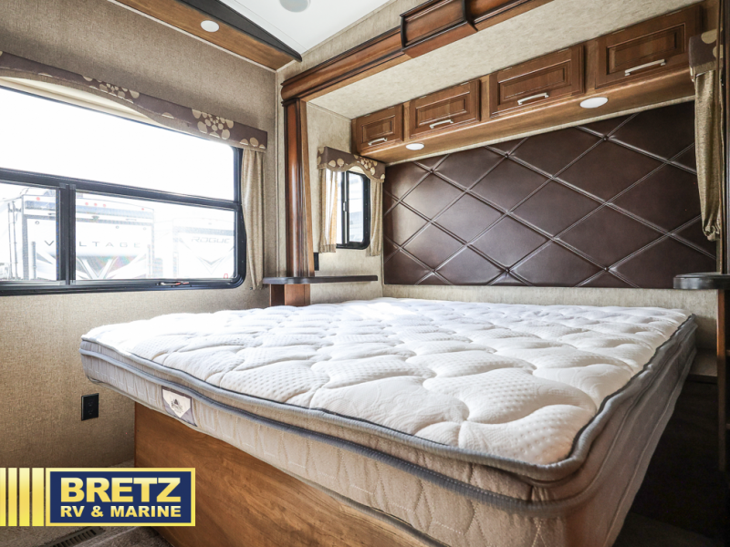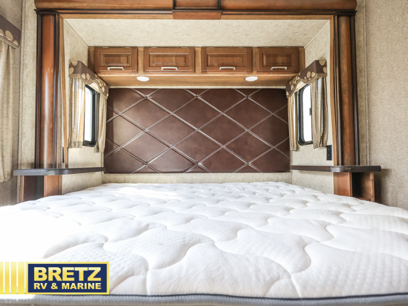 Continue on toward the rear and find a queen bed slide or optional king with storage beneath, and a slide out wardrobe opposite.