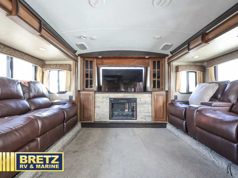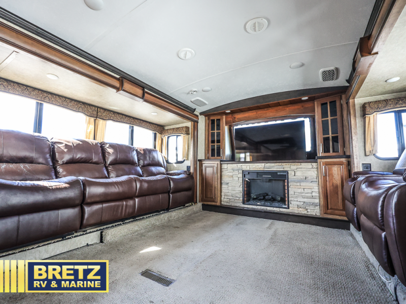 In front to the right of the main entry door head up the steps to a spacious front living area where you will find dual opposing slides. There is a slide out hide-a-bed to the right, and an L-shaped hide-a-bed sofa with connected recliner to the left. Along the front wall find a HDTV, and optional fireplace, plus so much more!