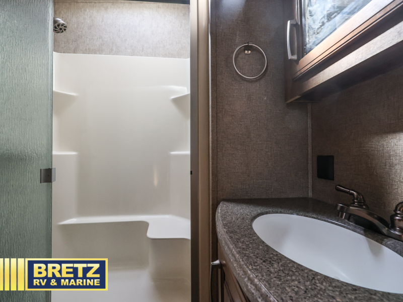 Head toward the rear of this unit and find a complete bath with sink, toilet, and a 48" x 30" shower with seat, plus linen storage. There is also a second outdoor entry right across the hall from the bathroom door which makes it convenient to access when enjoying time outside. This makes it just a quick step in to use.