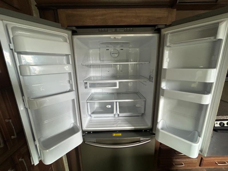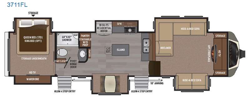 Step inside the centrally located entry door and find yourself in this 3711FL kitchen with dual opposing slides. There is a slide out for the dining table with four chairs to the left of the door. Straight ahead is a counter with double sink, and the slide opposite the door offers a three burner range, counter area, and 18 cu. ft. residential refrigerator. There is a small pantry just off the appliance slide, and a space prepped for a washer and dryer if you choose to add. You will also enjoy the convenient kitchen island which provides added food prep space and more.