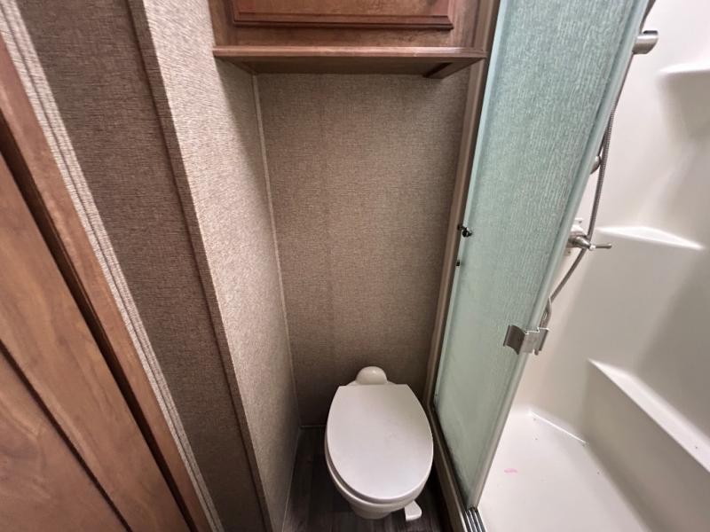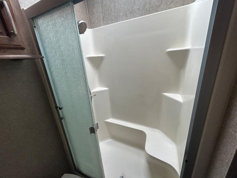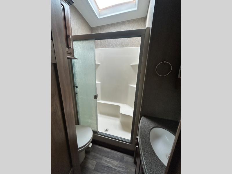 Head toward the rear of this unit and find a complete bath with sink, toilet, and a 48" x 30" shower, plus linen storage. There is also a second outdoor entry right across the hall from the bathroom door which makes it convenient to access when enjoying time outside making it a quick step in to use.