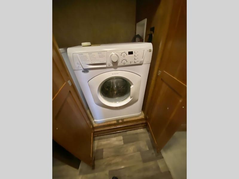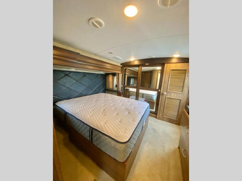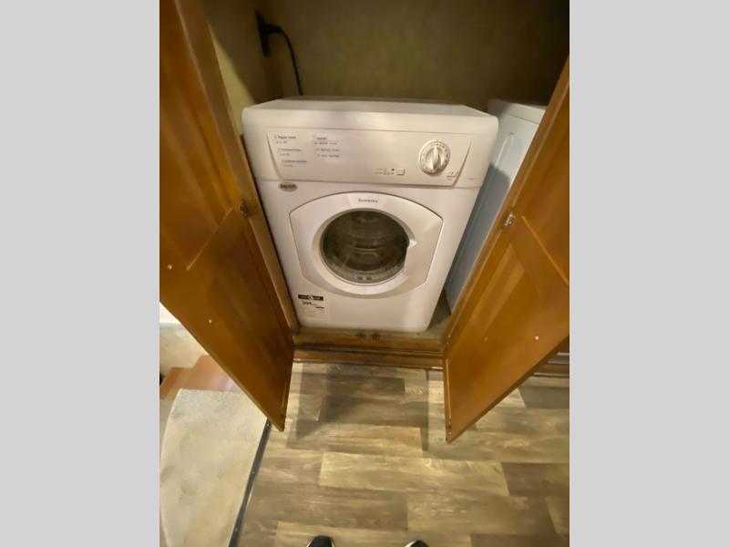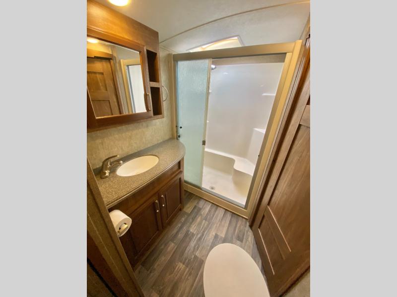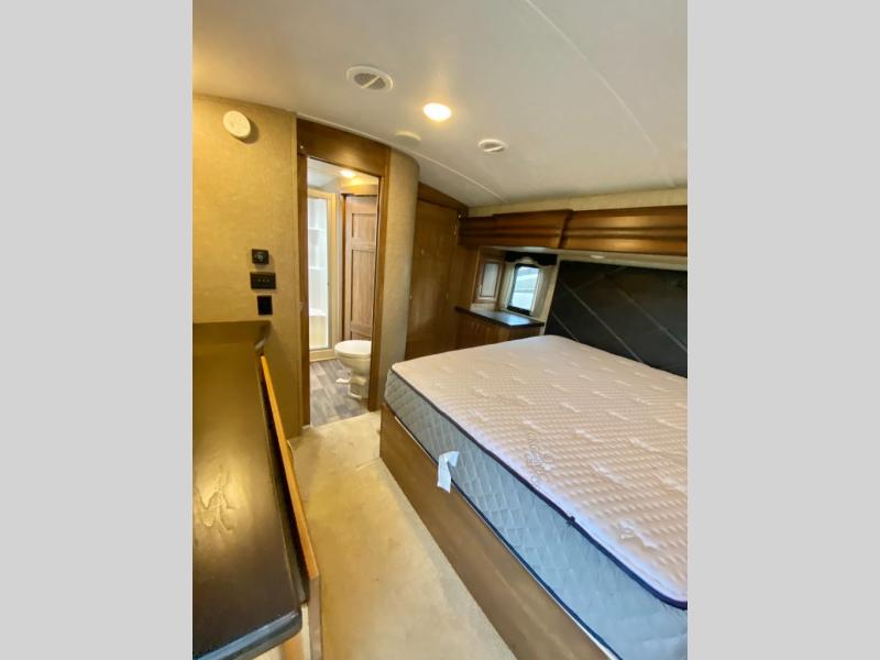 The bath features a 48" x 30" shower with seat, toilet, and vanity with sink. The sliding door in the bath leads to the front master suite. In the hall you will find a slide out space prepped for a washer and dryer that is also connected to the bedroom closet and queen bed slide out. You can choose an optional king bed if you enjoy a bit more sleeping space, and both offer storage beneath the bed.