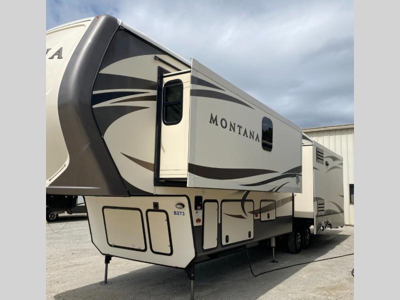 This Keystone Montana fifth wheel features loads of interior space with three large slide outs, a rear living room layout, and a convenient kitchen island.