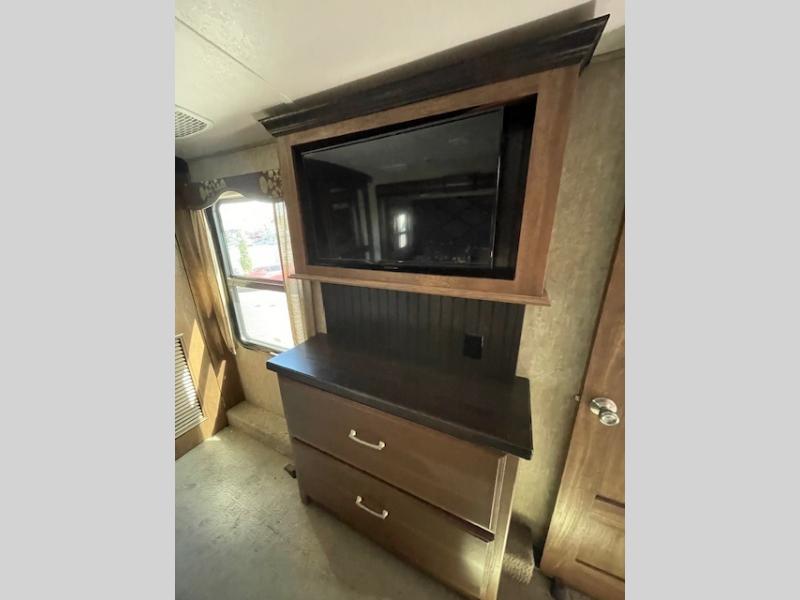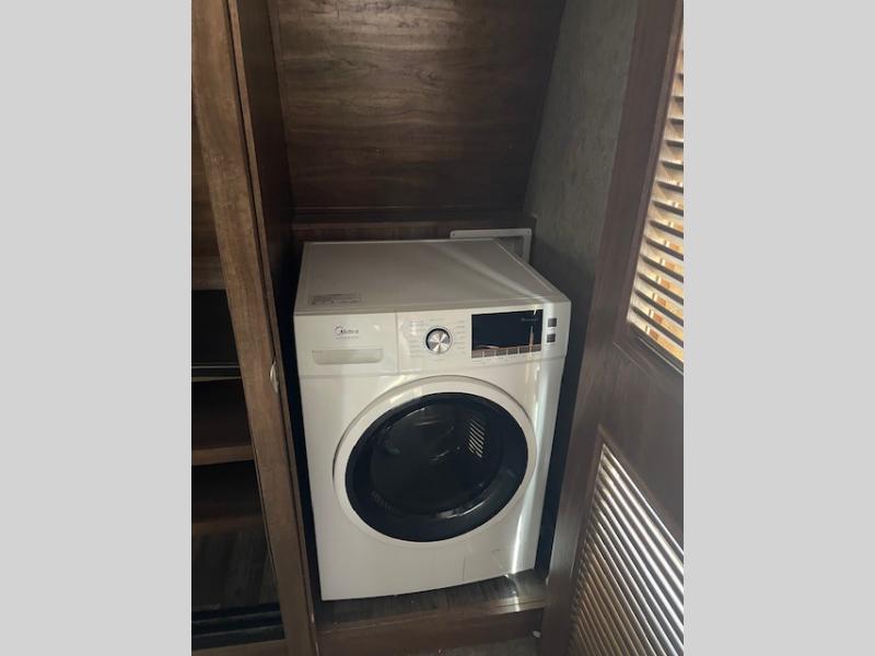 At the end of the hall through the door enjoy a spacious front bedroom retreat. Inside find a slide out queen or optional king size bed with storage underneath. There is also a dresser with HD TV above, and closet along the front wall with a washer and dryer prepped space on either side.