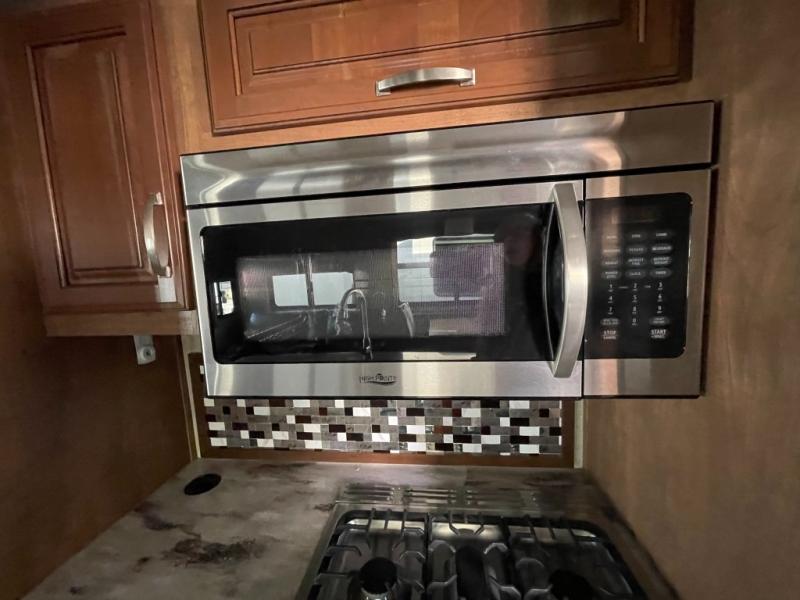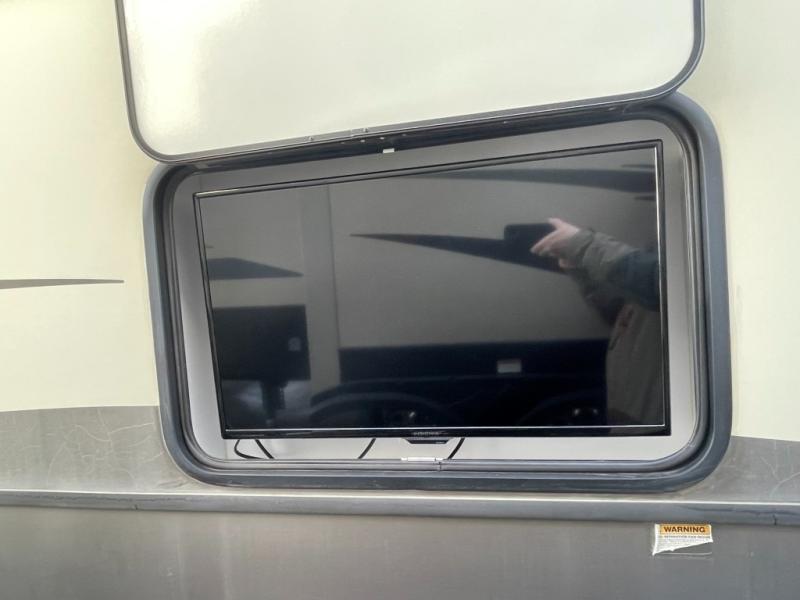Step inside and take a look around. To your left you will find a spacious and inviting living area and kitchen combined. There is a dinette with four chairs and theater seating to the left of the entry door. Along the rear wall you will find more seating with a hide-a-bed sofa in this space. There is overhead cabinetry the entire width of the unit, and a 48" HDTV with fireplace adjacent in the end of the kitchen slide out found along the road side.
