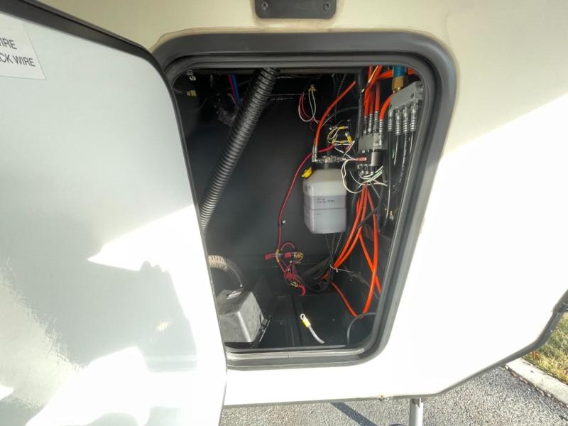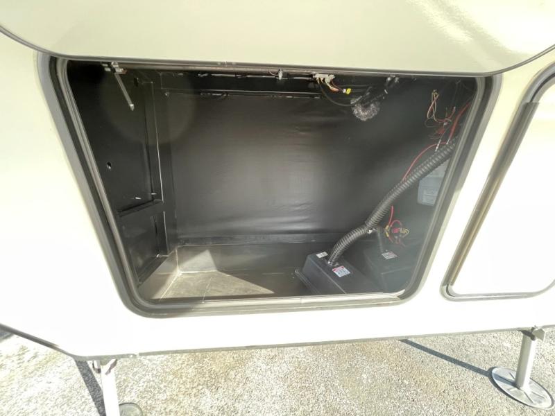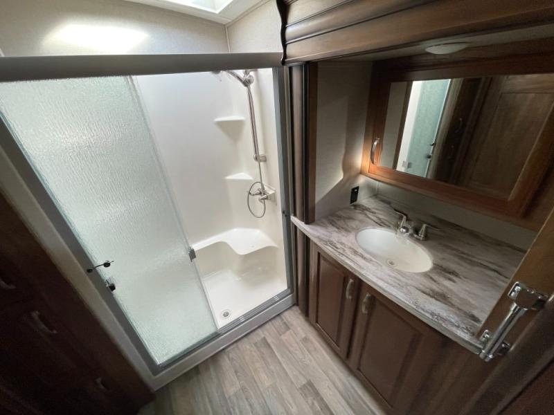 Head up the steps to the master bedroom and suite bath. Through the pivot hinged door on your left enter the bathroom where you will find a 48" x 30" shower, a toilet, and sink including overhead storage found in the beginning of the road side master suite slide. Next, a walk in closet has been prepped for a washer/dryer allowing you to add the convenience if you wish. There is also a wardrobe along the interior portion of the closet.