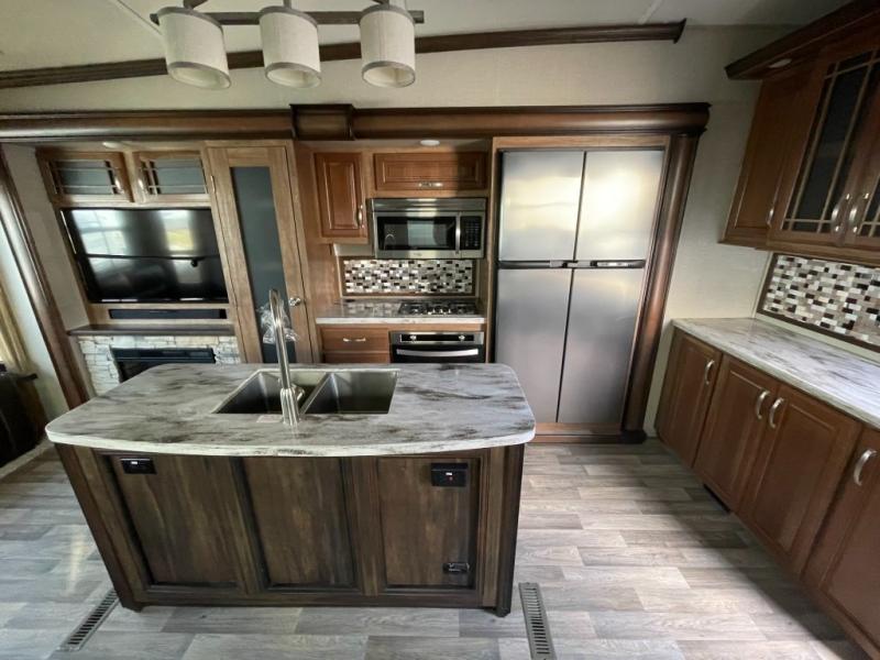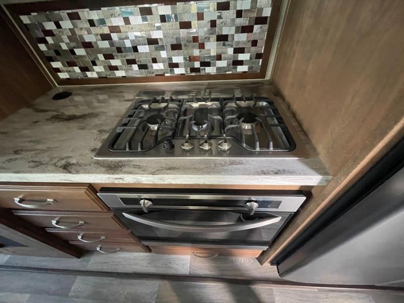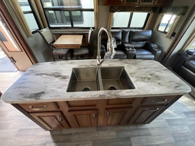 When it comes to meal time you will easily be able to whip up something fresh that your family enjoys. You will have a three burner range with convection microwave oven overhead to do any of the cooking you like. For food storage a pantry for dry and canned goods, plus an 18 cu. ft. RV refrigerator for your perishables. There is also ample counter space and storage with the island in the center featuring double sinks for cleaning up, and along the interior wall you will find more counter space with storage overhead for your daily dishes and things.