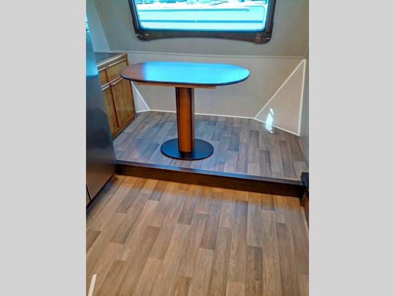 Head up the steps just to the right of the second side entry door into the raised front kitchen. Here you will see a slide out buffet with overhead cabinets for plenty of storage. A u-shaped dinette fits across the front for gathering to enjoy a meal cooked easily with this great setup. There is an L-shaped counter with a double sink, a three burner range with overhead convection microwave oven, and an 18 cu. ft. RV refrigerator, plus center skylight.