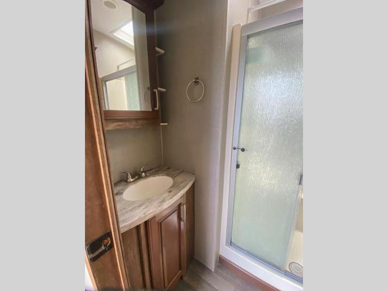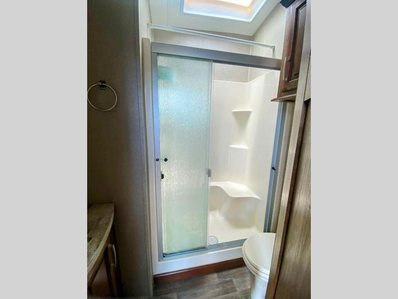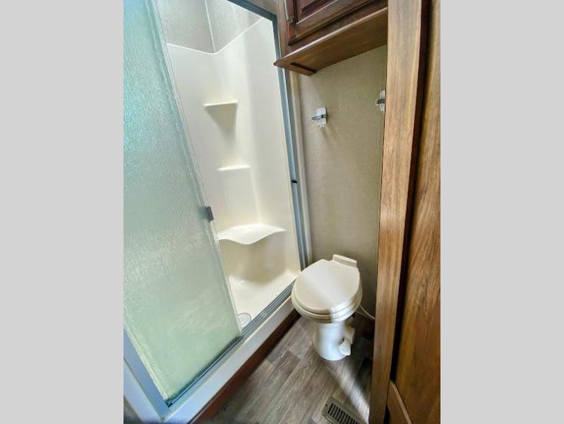 Step inside the rear most entry door and find a conveniently located bathroom almost across from the door. Inside you will find a 48" x 30" shower, toilet, and vanity with sink.
