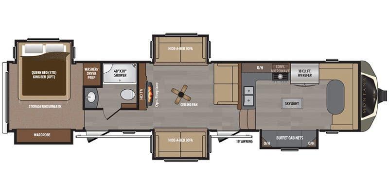 Down the hall toward the front of this Montana fifth wheel you will enter a spacious central living area thanks to another set of dual slide outs. Here the slide outs each feature a hide-a-bed sofa. Along the interior wall shared with the bathroom enjoy an HDTV and optional fireplace. There is also a set of theater seats opposite allowing for plenty of seating and sleeping space for overnight guests.