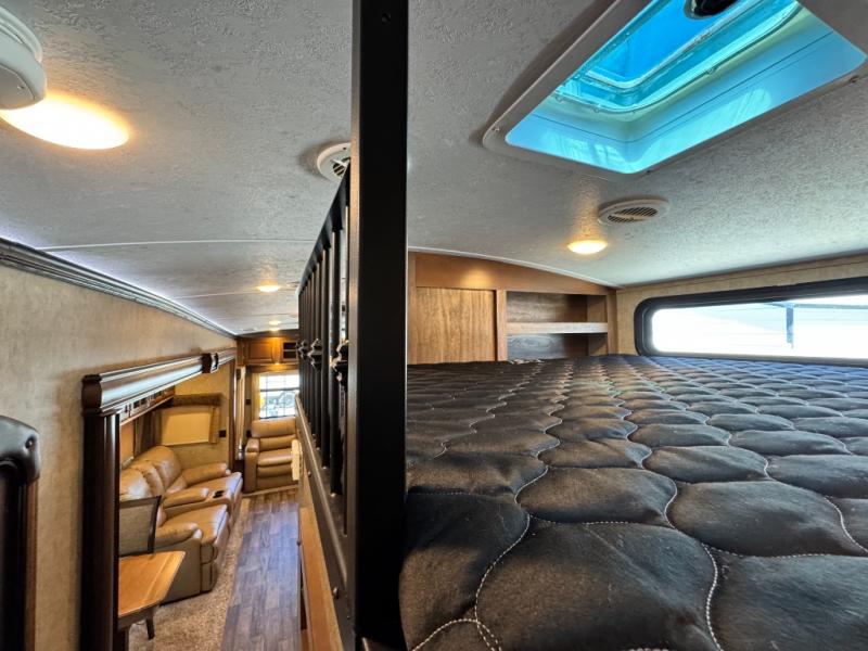 Luxury fifth wheel with rear living, a center bonus room (mid-bunk/office), and a loft above the bonus room, plus a front master suite.