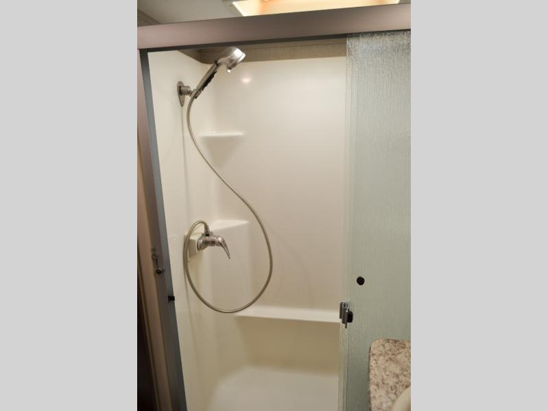 To the right of the entry door step up to find a coat closet and a side aisle bath. Enter through the pivot hinge door to find a 48" x 30" shower with seat, toilet, linen storage, and a vanity with sink.