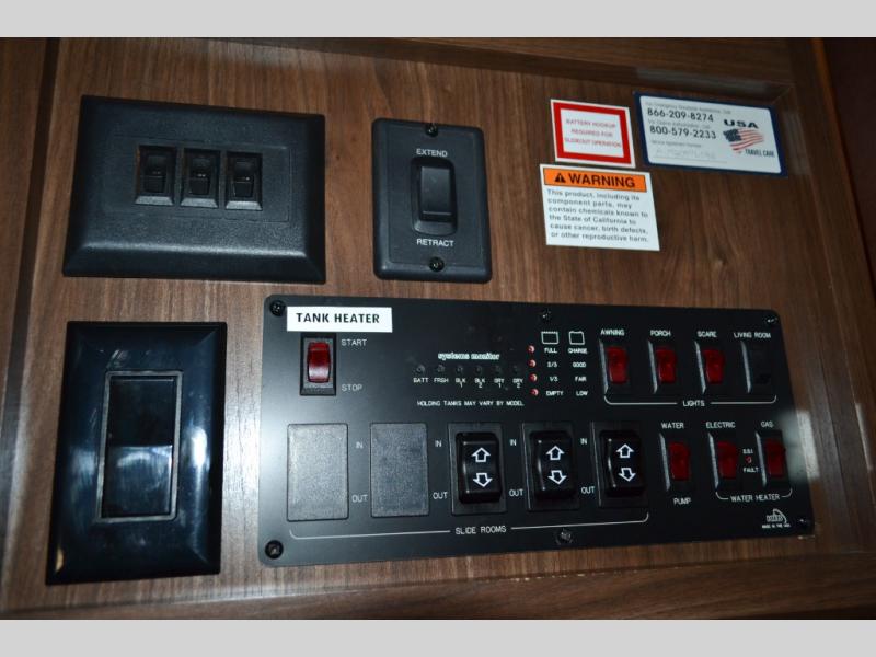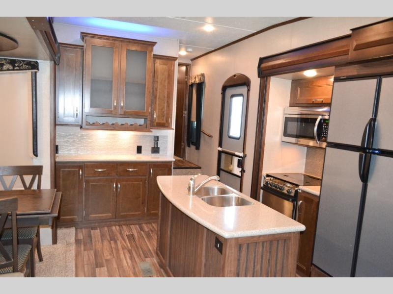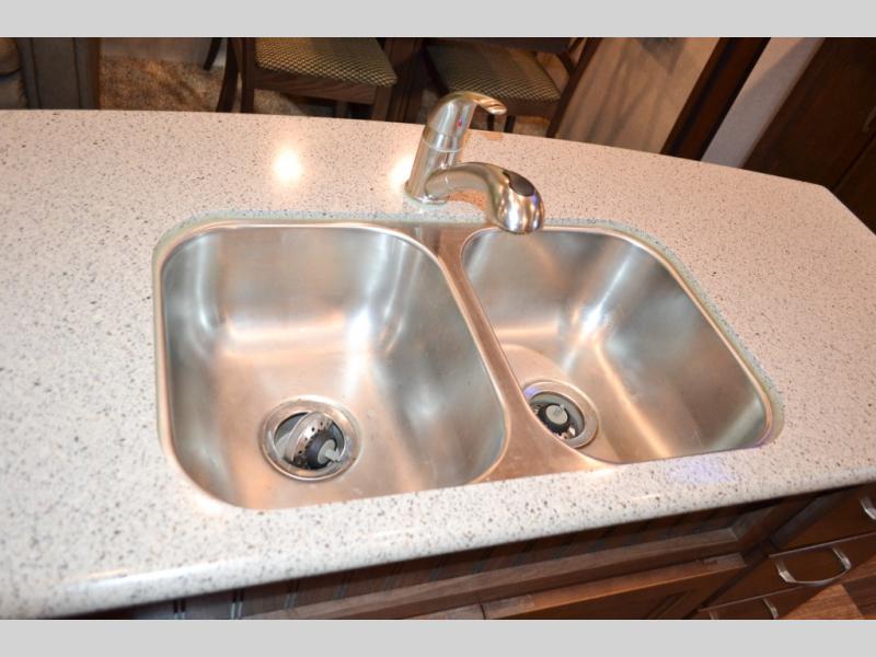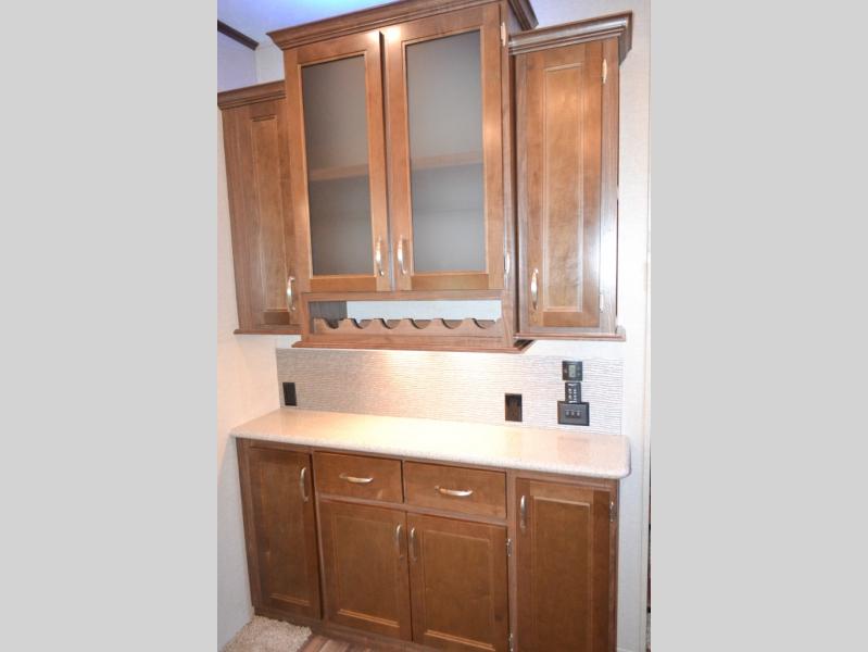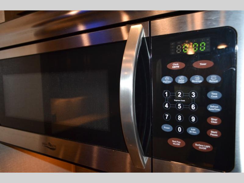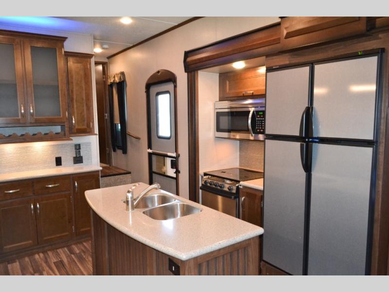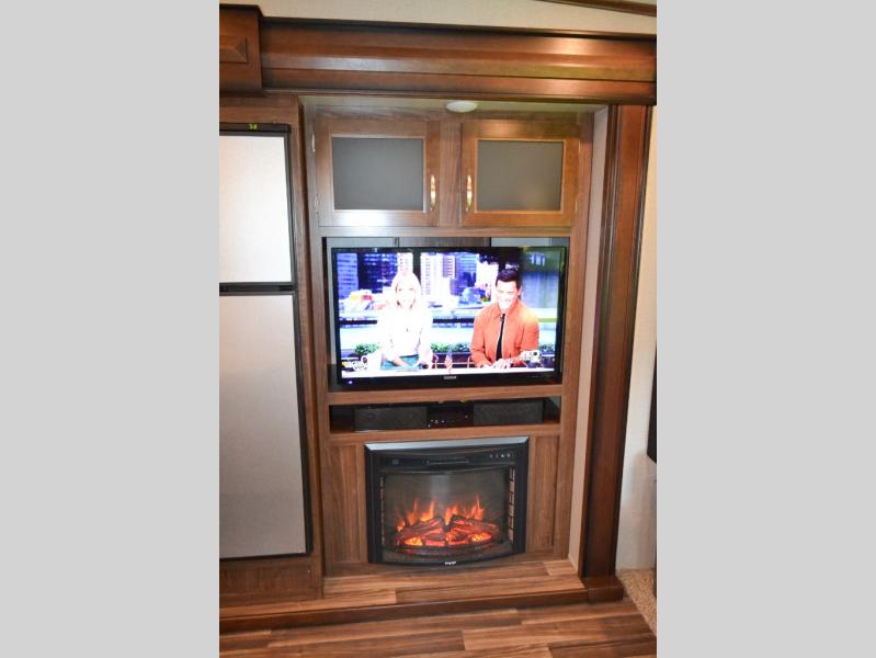 Upon entering model 305RL you will see the kitchen amenities to your immediate left with a slide out three burner range, residential microwave, overhead storage, and a RV refrigerator. There is also an entertainment center within this kitchen slide that provides a HDTV and fireplace. The kitchen island features a double sink and additional counter space as well. There is a convenient hutch located along the interior wall straight in from the entry door for more storage needs.