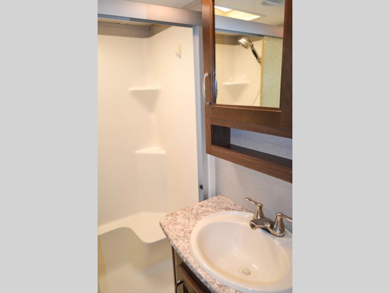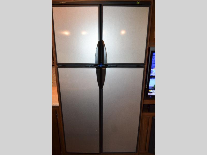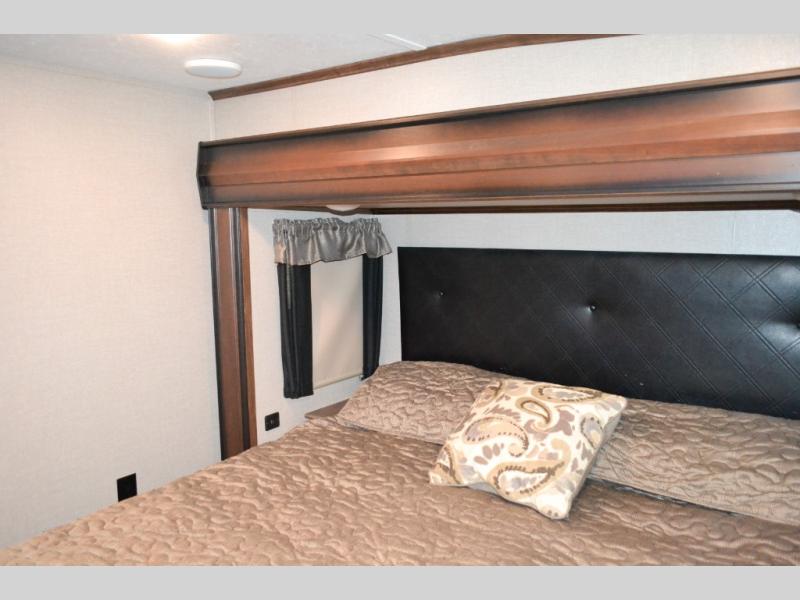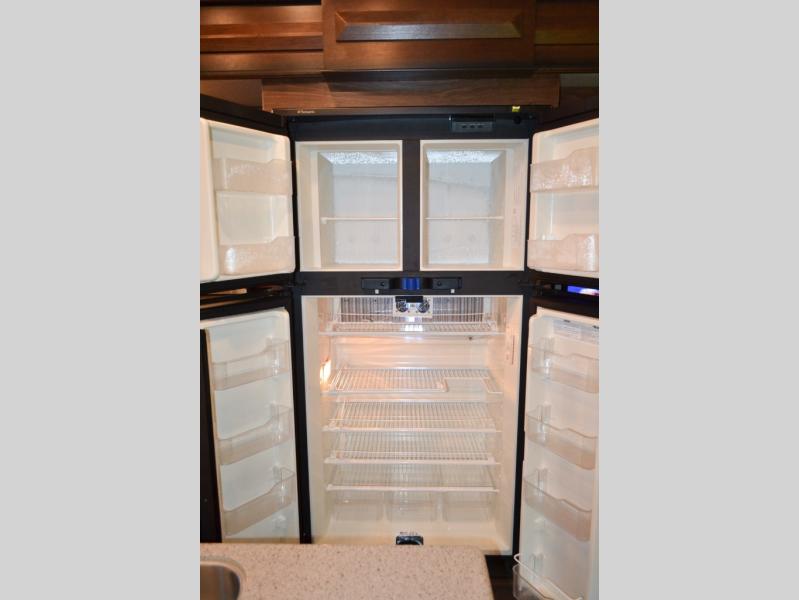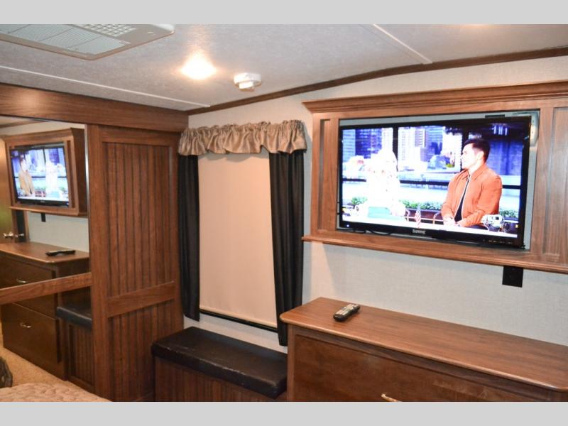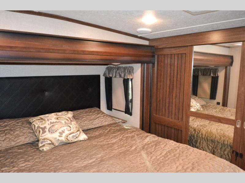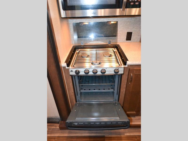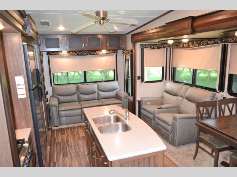 Upon entering model 305RL you will see the kitchen amenities to your immediate left with a slide out three burner range, residential microwave, overhead storage, and a RV refrigerator. There is also an entertainment center within this kitchen slide that provides a HDTV and fireplace. The kitchen island features a double sink and additional counter space as well. There is a convenient hutch located along the interior wall straight in from the entry door for more storage needs.