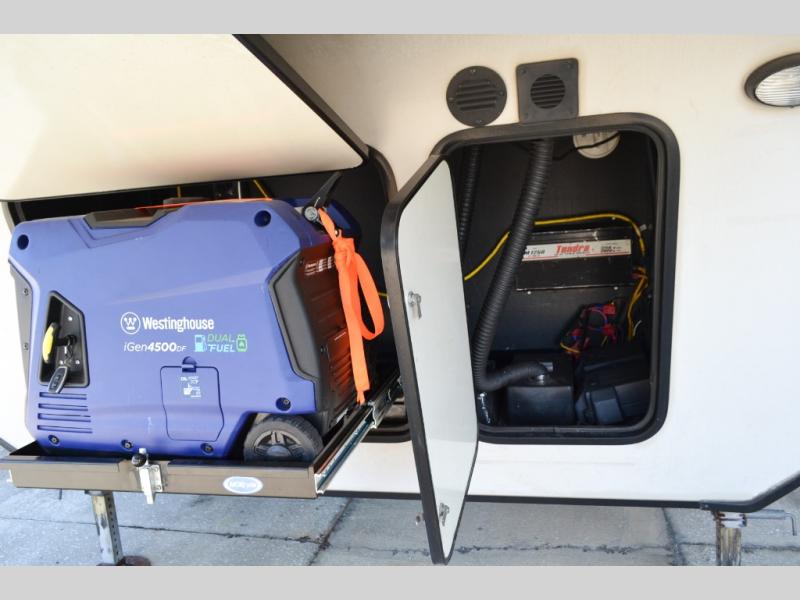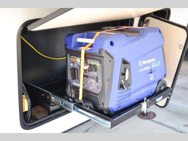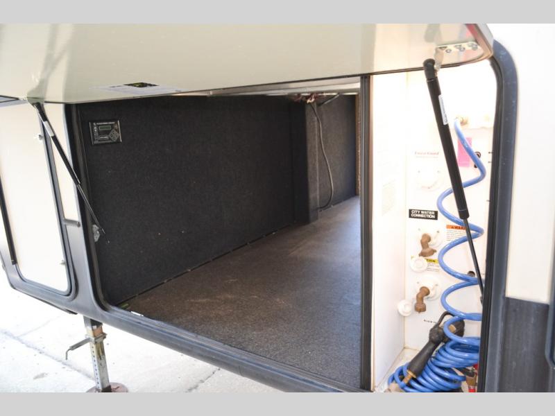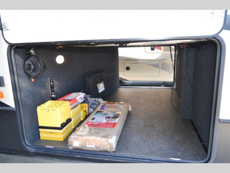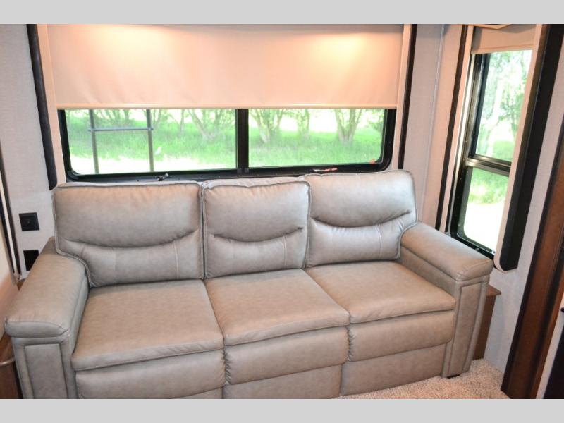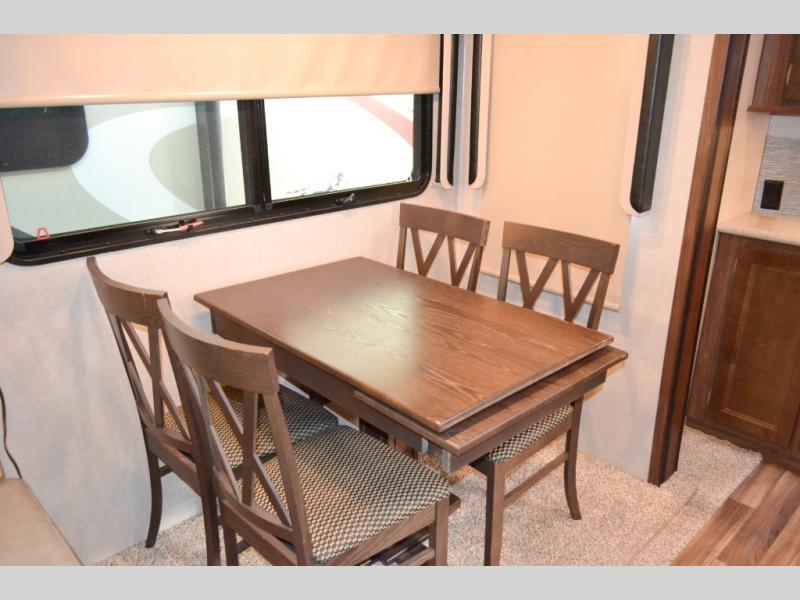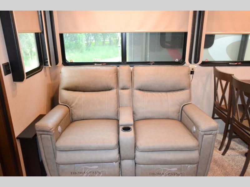 The rear wall features a hide-a-bed sofa with overhead storage to keep your things neat and organized. The second slide in the main living area features a free standing dinette with four chairs, and optional theater seating for two with an overhead cabinet and cup holders.