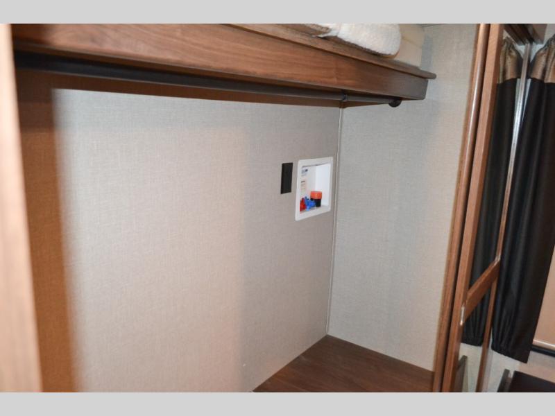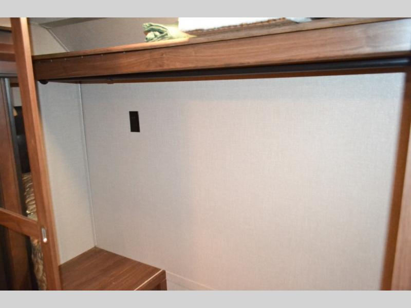 Continue to the end of the hall into a private front bedroom featuring a queen slide out bed, or optional king if you enjoy a bit more space to sleep. There is also a dresser opposite the bed with a 32" HDTV above, a seating area with laundry hamper below, and a front wardrobe for clothing storage. You will also find either end of the wardrobe is prepped for a washer and dryer if you choose to add the appliances, plus so much more!