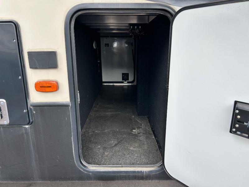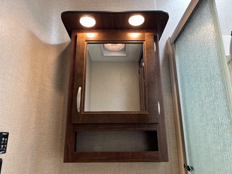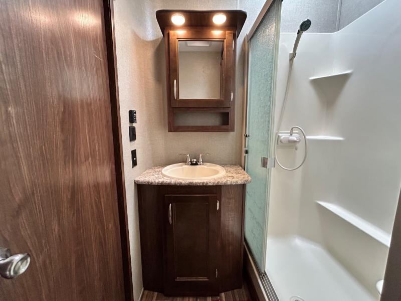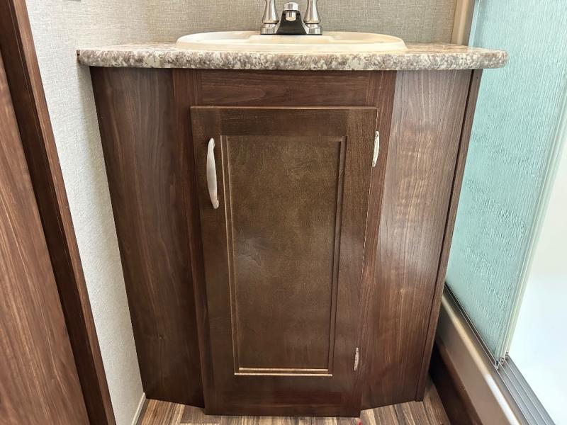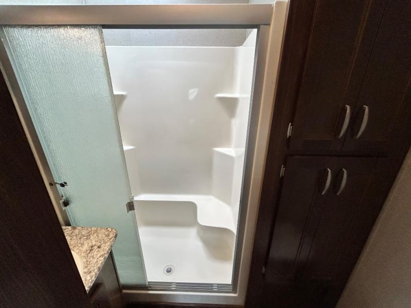 Head toward the rear to find a side aisle bath on your left. The bath includes a 48" x 30" shower with seat, toilet, and vanity with sink, plus overhead cabinet. Almost straight across from the bath entry is a second outside entry door. Here you will have quick access to the restroom as well as to the outside.