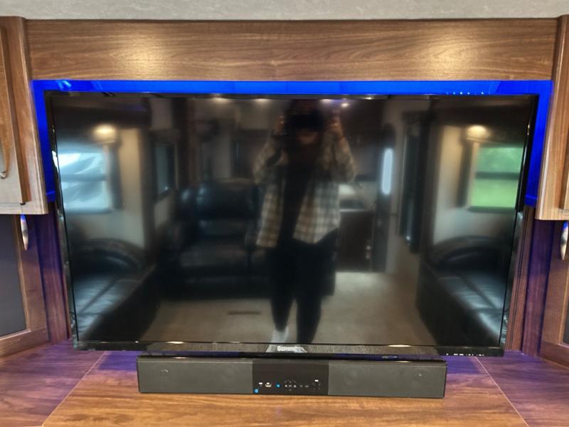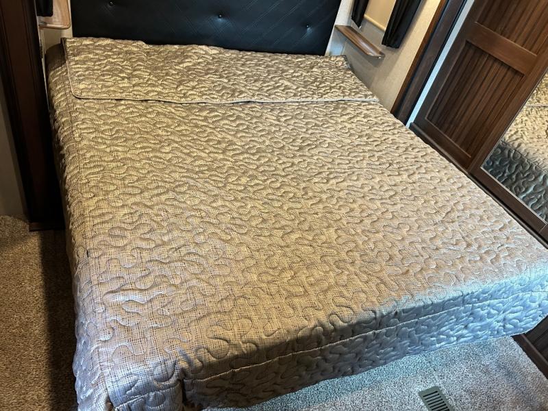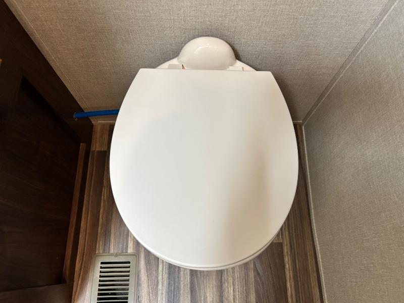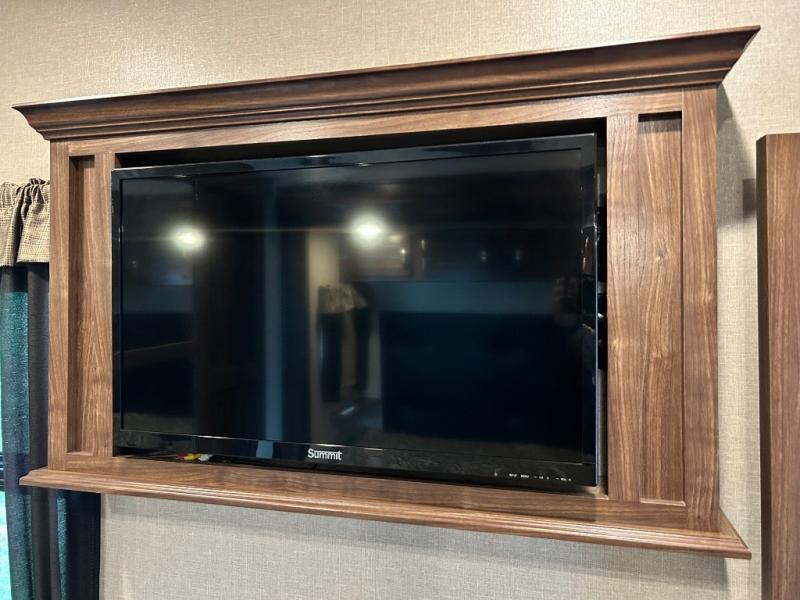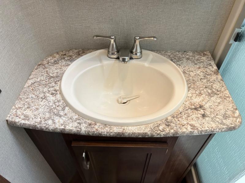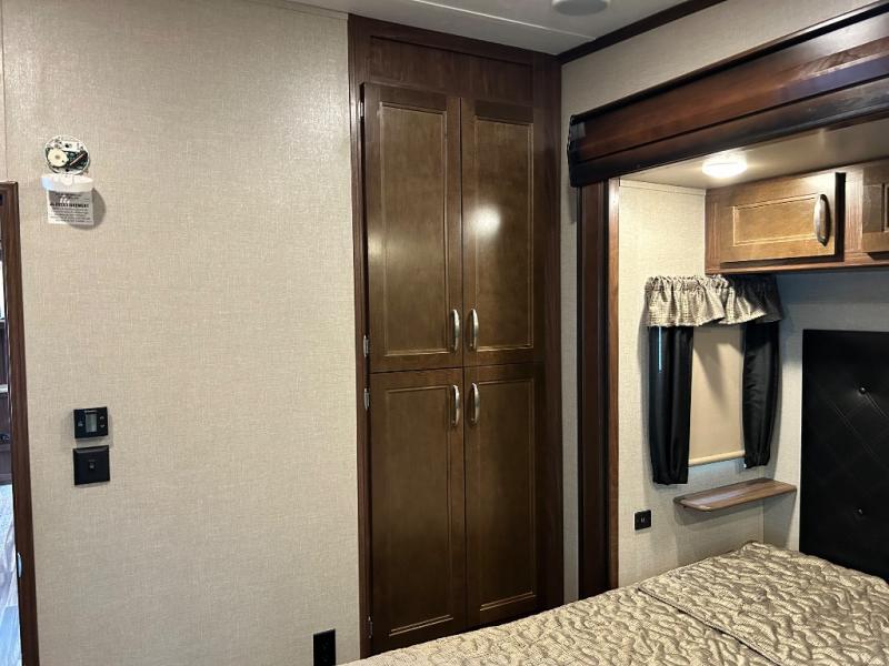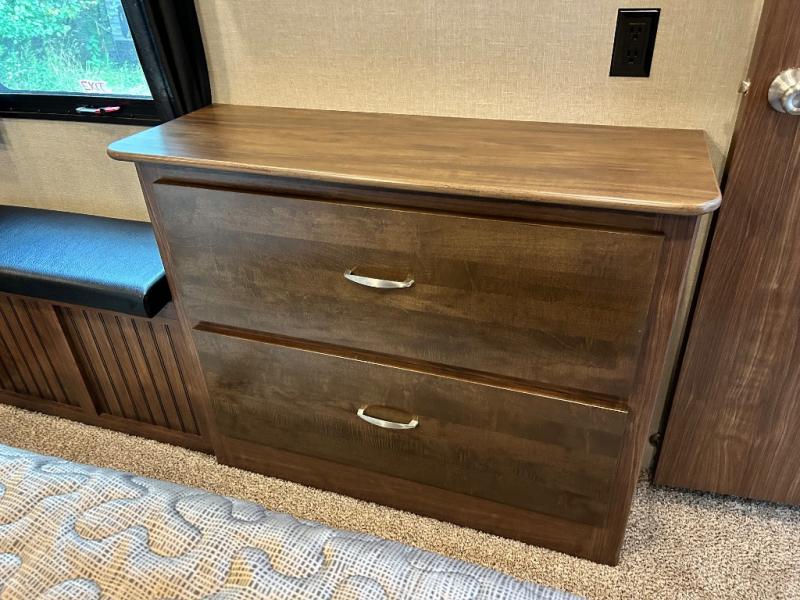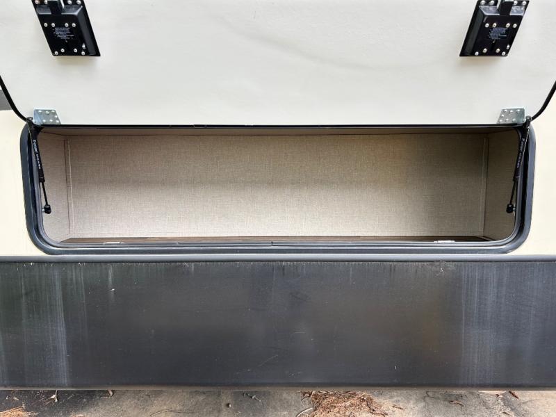 The rear of the fifth wheel features a spacious master bedroom with queen or optional king bed slide. There is storage beneath the bed, in the large rear wardrobe, and in the dresser opposite the bed. You will also find a seating area along the road side between the dresser and the full rear wardrobe. Above the dresser find a 32" HDTV to enjoy once you retire for the evening. You may even choose to add a washer/dryer option to the prepped closet as an added convenience.