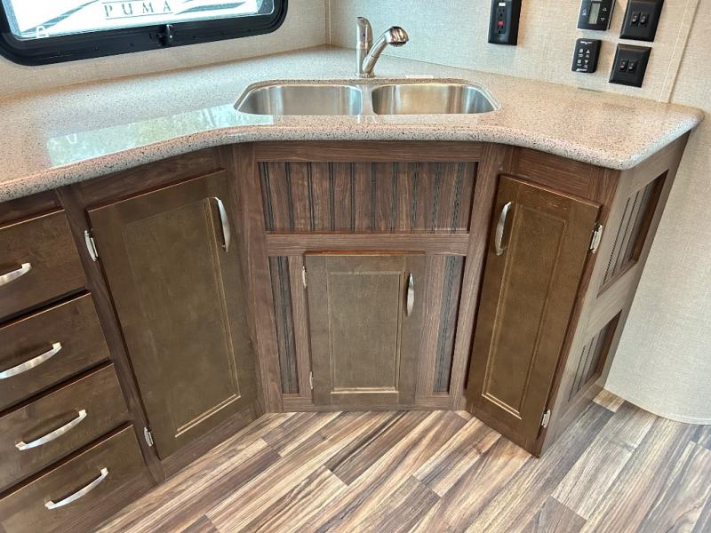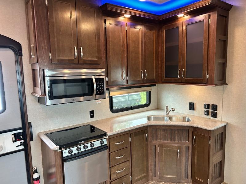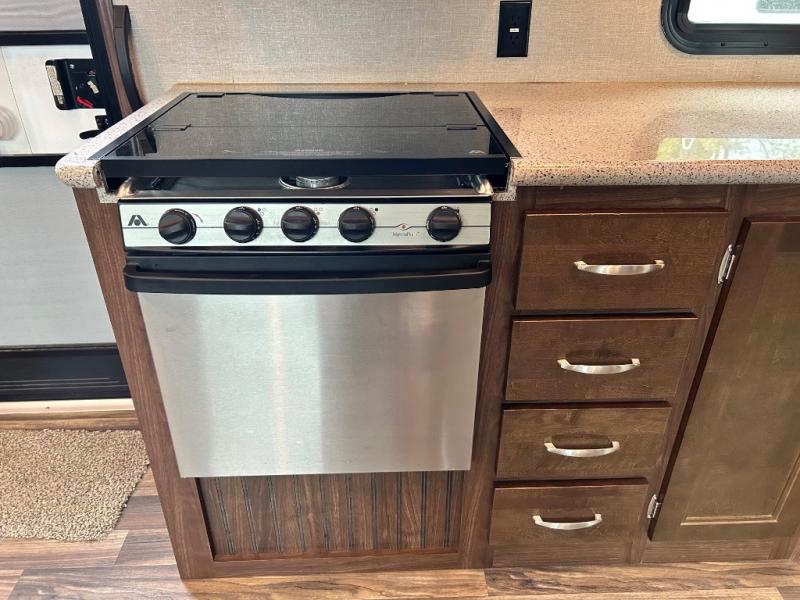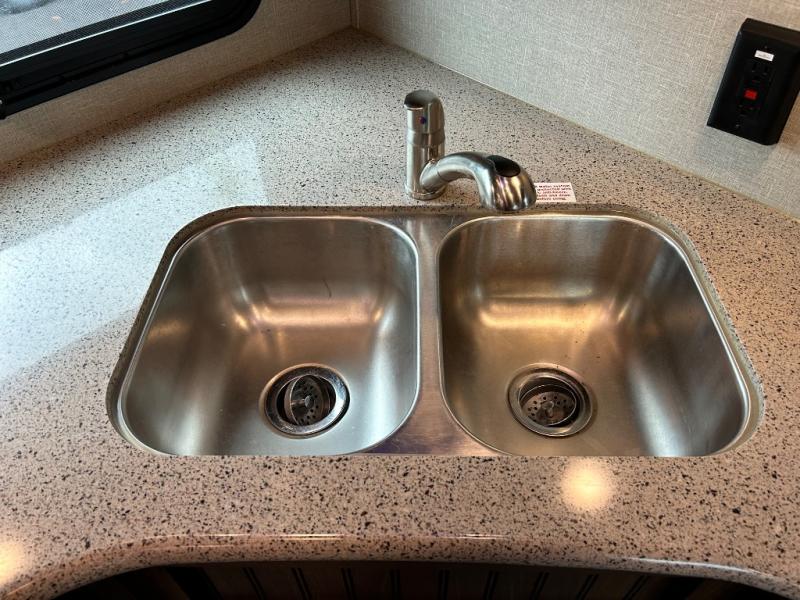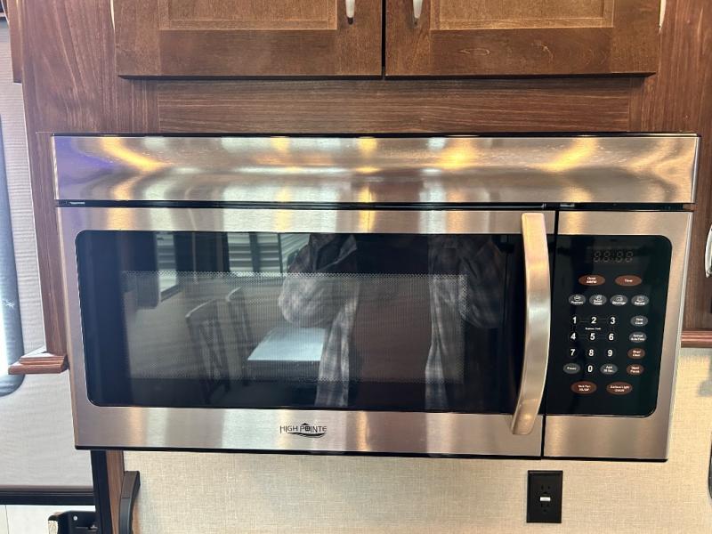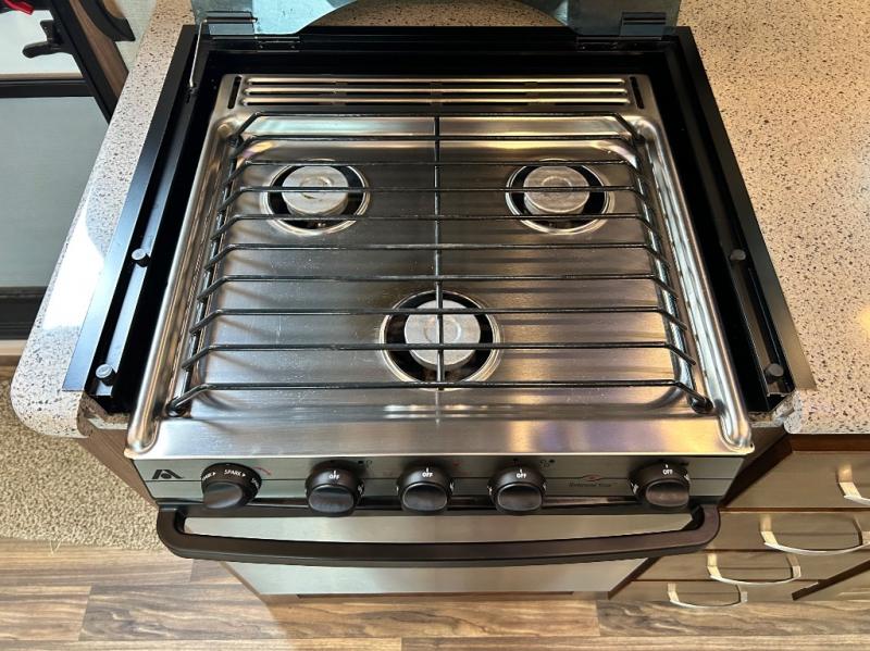 Back down to the main level you will find the kitchen and dining area. You can make your favorite meals with the three burner range, residential microwave, and double kitchen sink along the curb side wall. There is a hutch and overhead storage for your dishes and things. A road side slide out includes a free standing dinette and RV refrigerator.