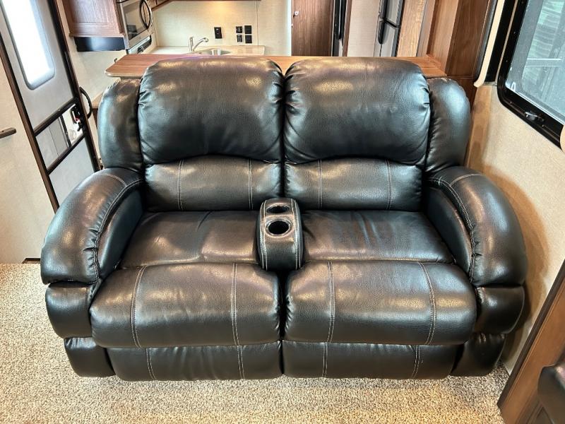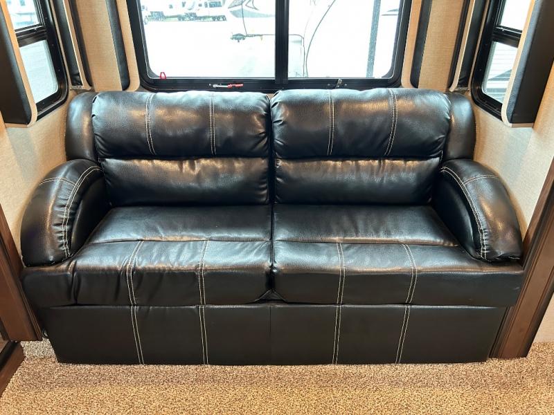Step up to the front living space in this Keystone Montana High Country 374FL fifth wheel and you will find plenty of seating, and even sleeping space for overnight guests with two hide-a-bed sofas. There is one on either side that slides out maximizing the space in the living room. There is also theater seating, and a full front entertainment center with storage both above and below. You will also enjoy a HDTV with fireplace beneath.