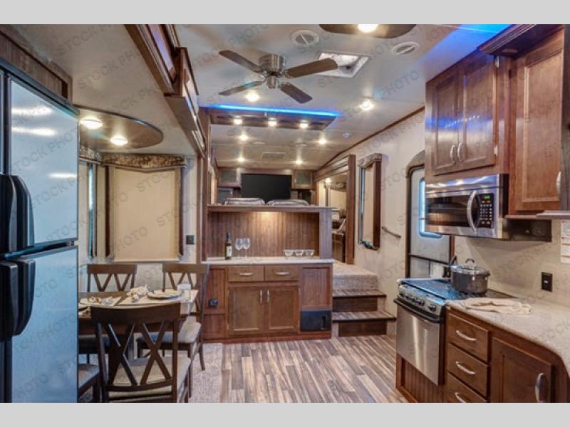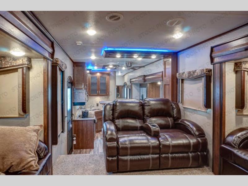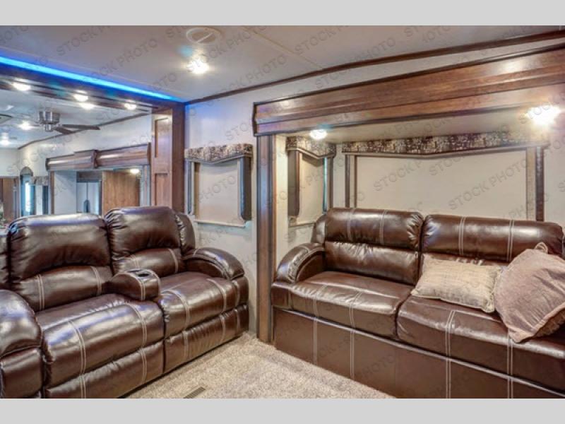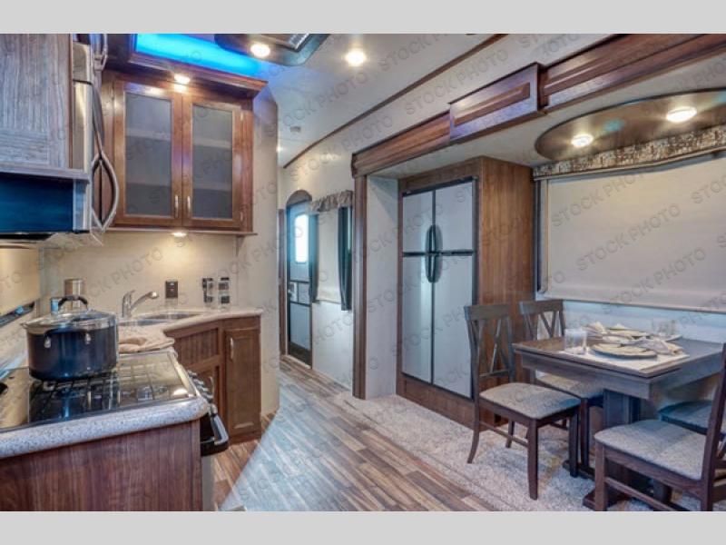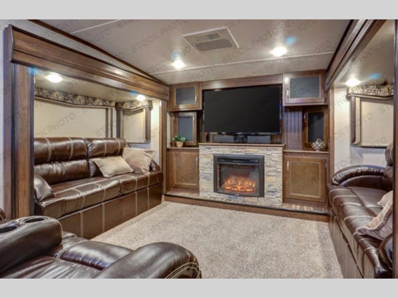 Step up to the front living space in this Keystone Montana High Country 374FL fifth wheel and you will find plenty of seating, and even sleeping space for overnight guests with two hide-a-bed sofas. There is one on either side that slides out maximizing the space in the living room. There is also theater seating, and a full front entertainment center with storage both above and below. You will also enjoy a HDTV with fireplace beneath.