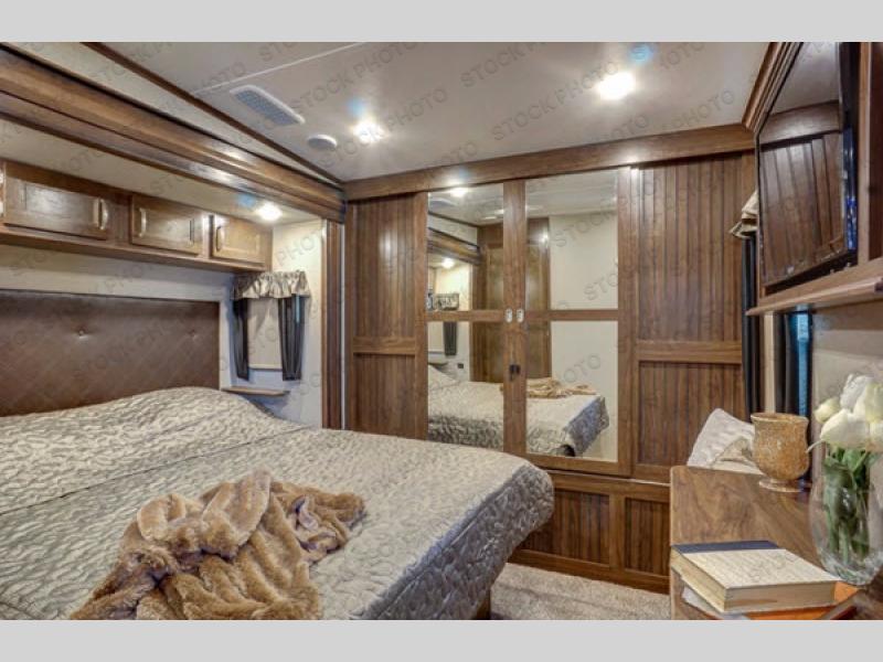 The rear of the fifth wheel features a spacious master bedroom with queen or optional king bed slide. There is storage beneath the bed, in the large rear wardrobe, and in the dresser opposite the bed. You will also find a seating area along the road side between the dresser and the full rear wardrobe. Above the dresser find a 32" HDTV to enjoy once you retire for the evening. You may even choose to add a washer/dryer option to the prepped closet as an added convenience.