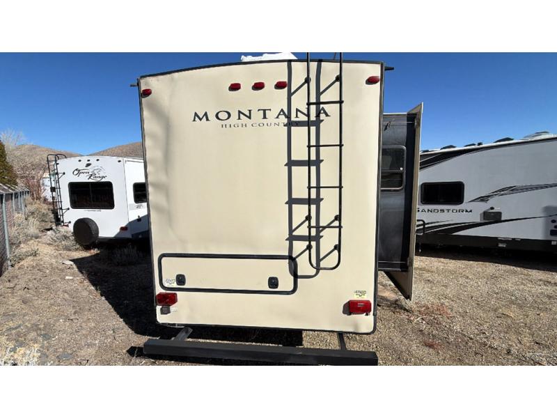 On the outside of this Montana High Country unit you will find exterior storage, a 19' awning, and a fold down bike rake, plus so much more!