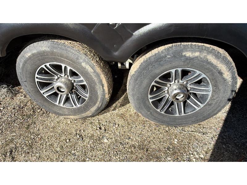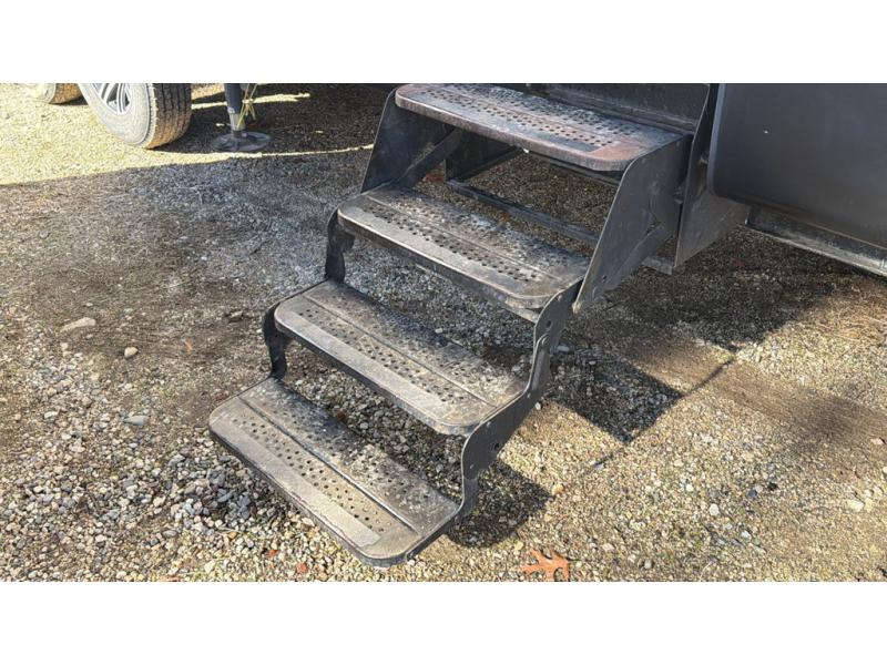 Head toward the rear to find a side aisle bath on your left. The bath includes a 48" x 30" shower with seat, toilet, and vanity with sink, plus overhead cabinet. Almost straight across from the bath entry is a second outside entry door. Here you will have quick access to the restroom as well as to the outside.