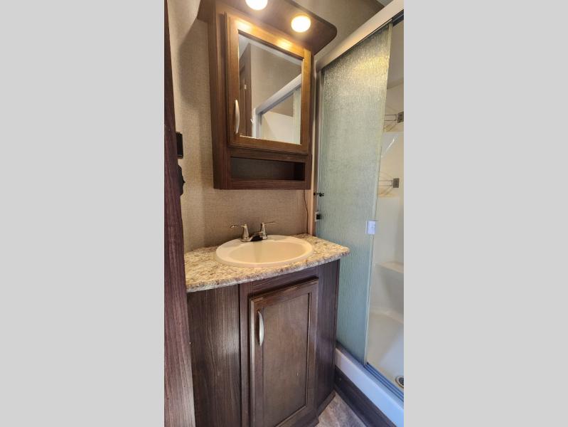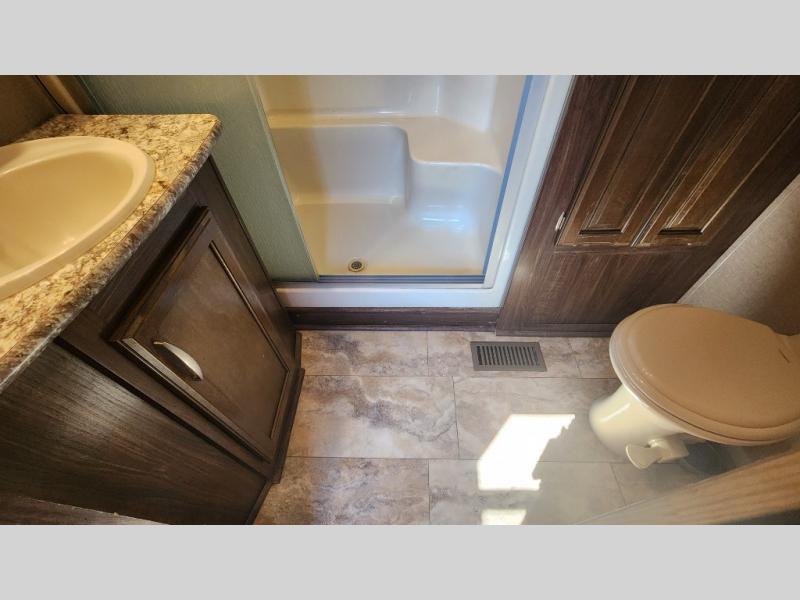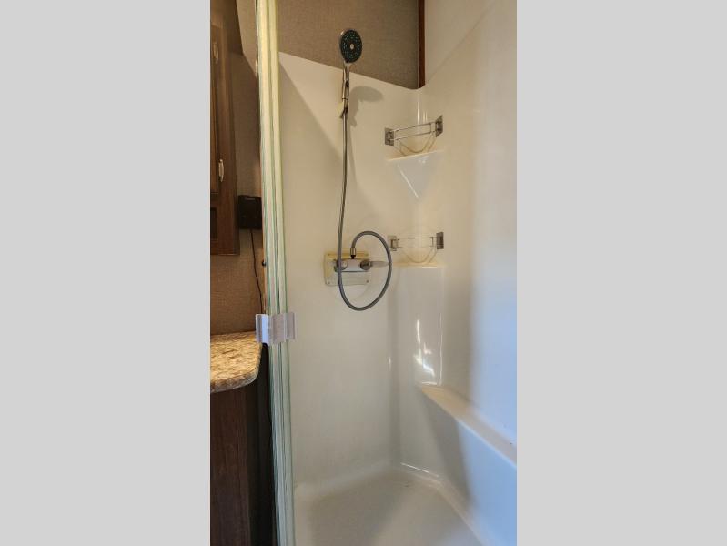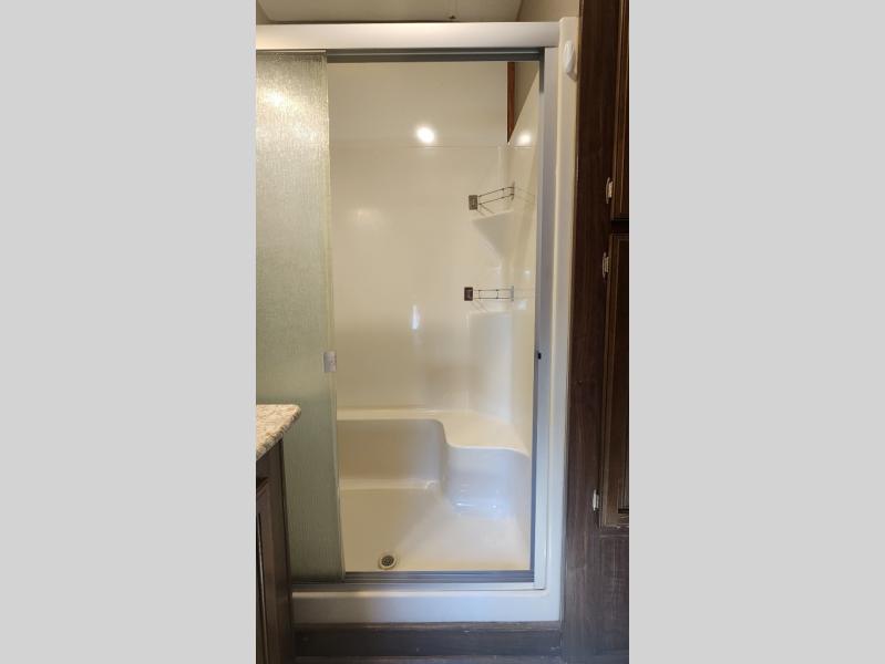 Head toward the rear to find a side aisle bath on your left. The bath includes a 48" x 30" shower with seat, toilet, and vanity with sink, plus overhead cabinet. Almost straight across from the bath entry is a second outside entry door. Here you will have quick access to the restroom as well as to the outside.