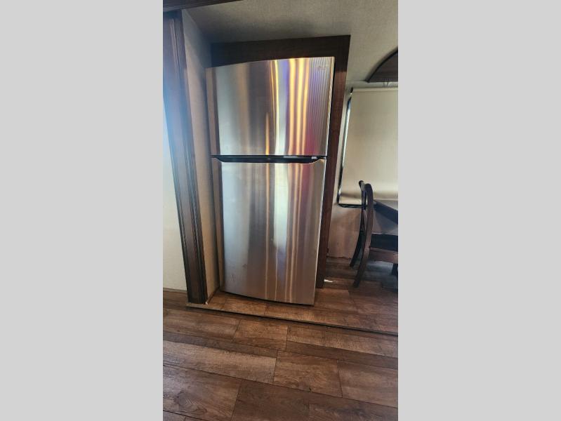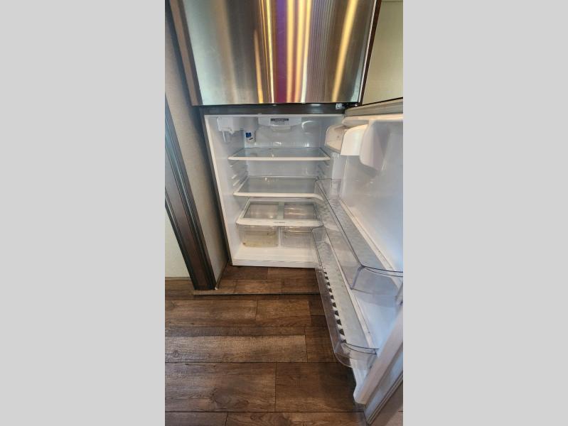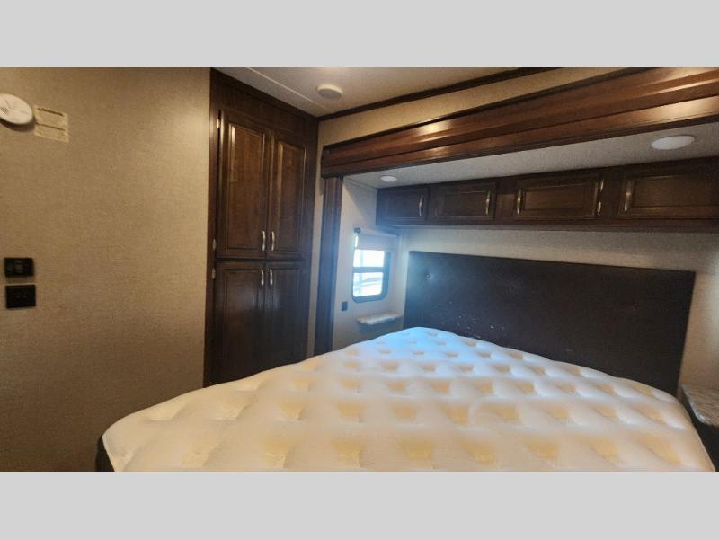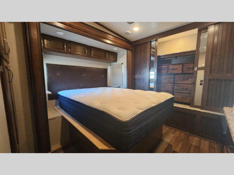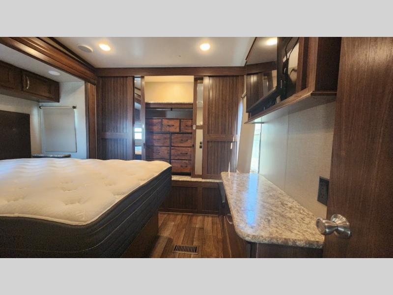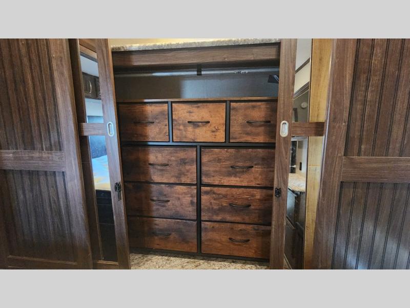 The rear of the fifth wheel features a spacious master bedroom with queen or optional king bed slide. There is storage beneath the bed, in the large rear wardrobe, and in the dresser opposite the bed. You will also find a seating area along the road side between the dresser and the full rear wardrobe. Above the dresser find a 32" HDTV to enjoy once you retire for the evening. You may even choose to add a washer/dryer option to the prepped closet as an added convenience.