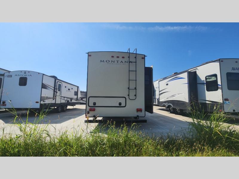 On the outside of this Montana High Country unit you will find exterior storage, a 19' awning, and a fold down bike rake, plus so much more!