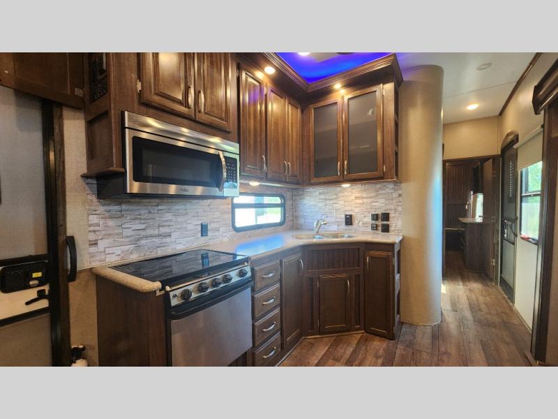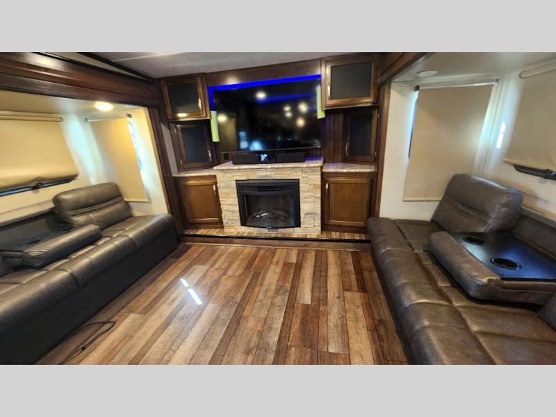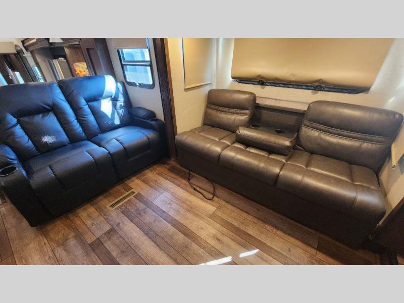 Step up to the front living space in this Keystone Montana High Country 375FL fifth wheel and you will find plenty of seating, and even sleeping space for overnight guests with two hide-a-bed sofas. There is one on either side that slides out maximizing the space in the living room. There is also theater seating, and a full front entertainment center with storage both above and below. You will also enjoy a HDTV with fireplace beneath.