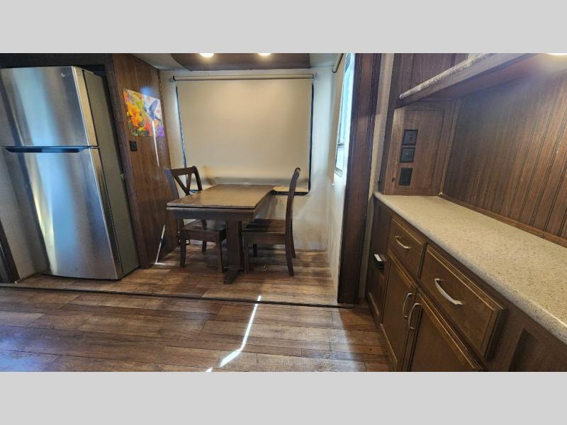 Back down to the main level you will find the kitchen and dining area. You can make your favorite meals with the three burner range, residential microwave, and double kitchen sink along the curb side wall. There is a hutch and overhead storage for your dishes and things. A road side slide out includes a free standing dinette and residential refrigerator.