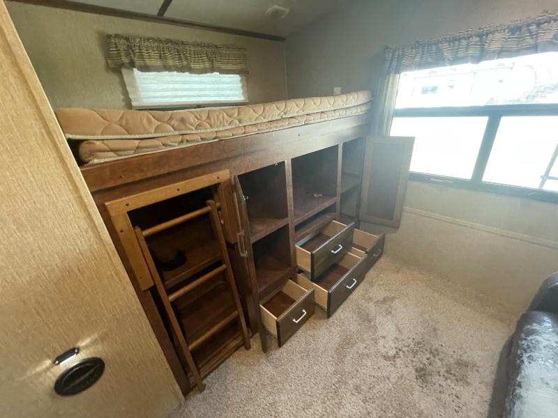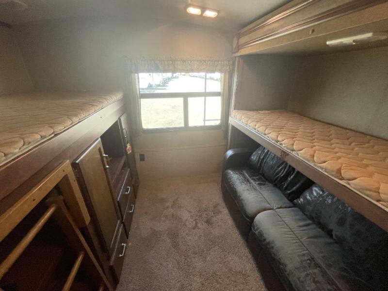 In the rear of the trailer there is a private bunkhouse featuring a sofa sleeper with bunk above along the road side. On the opposite side there is a second bunk above an entertainment center with storage.