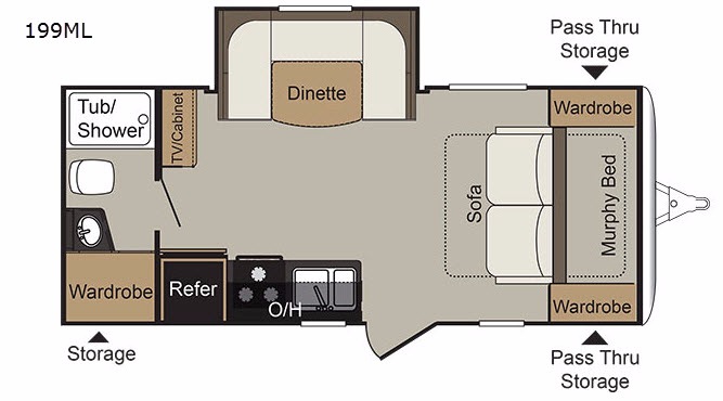 Enjoy plenty of living space by day, and a cozy bedroom area by night, all within the same space in this Keystone Passport Express travel trailer. Model 199ML offers a space saving Murphy Bed along the front wall providing you with ample living space without the need for a longer RV. This unit also features a u-shaped dinette, and rear bath layout, plus so much more!
