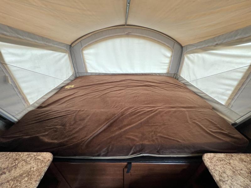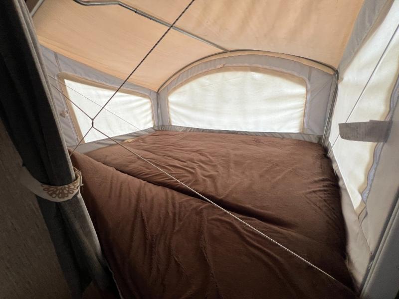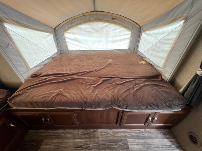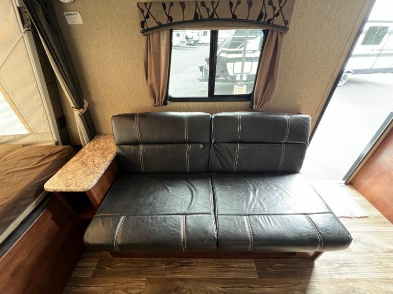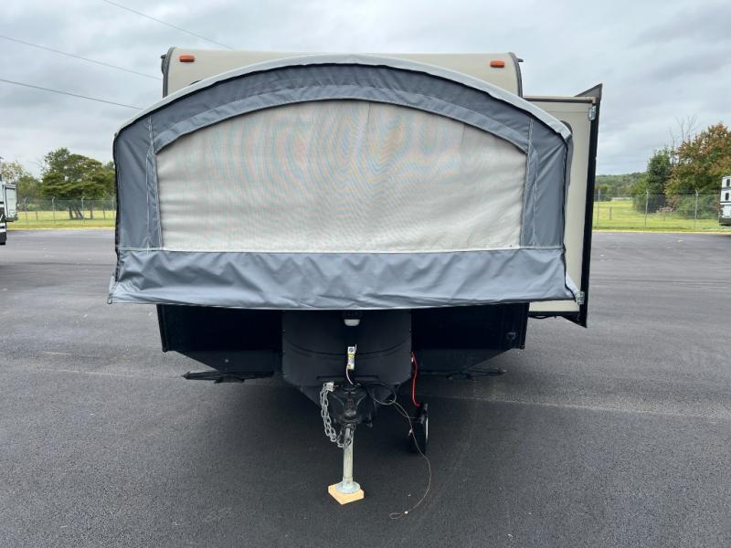 Enter and find a open living space with a fold-down sofa to your immediate right. Opposite enjoy the space created by a slide out u-dinette. There is an overhead storage shelf across the entire front of the unit before accessing the front queen tent end bunk. You will also like the entertainment center adjacent to the dinette slide for easy viewing from anywhere in the front seating and sleeping area.