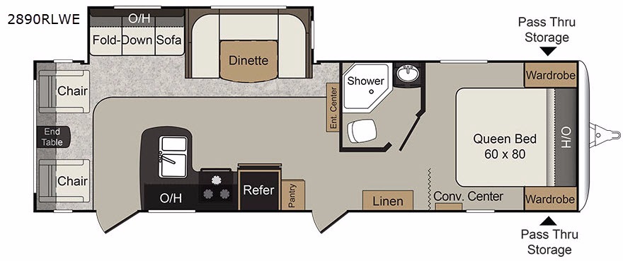 Enjoy this spacious Passport Grand Touring travel trailer model 2890RLWE by Keystone RV. You will love the convenient dual entry doors, the added space from a living room slide, and so much more!