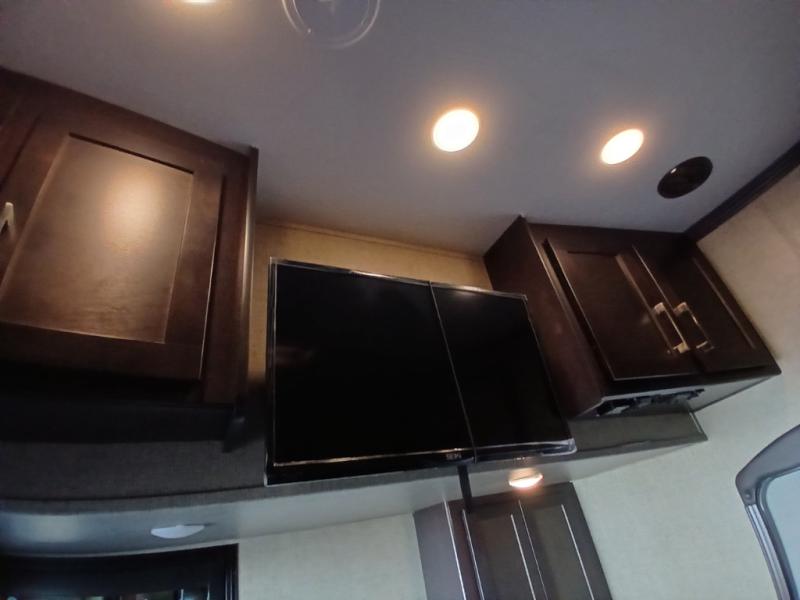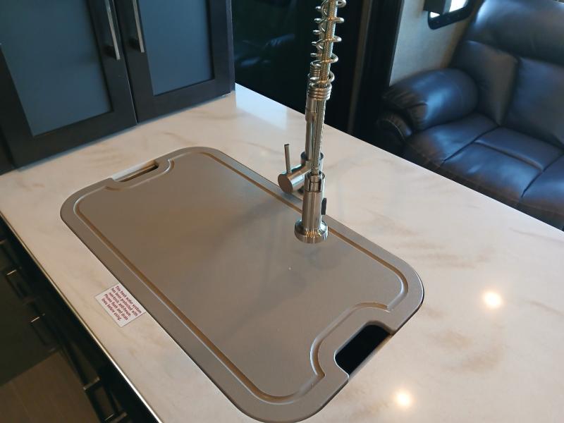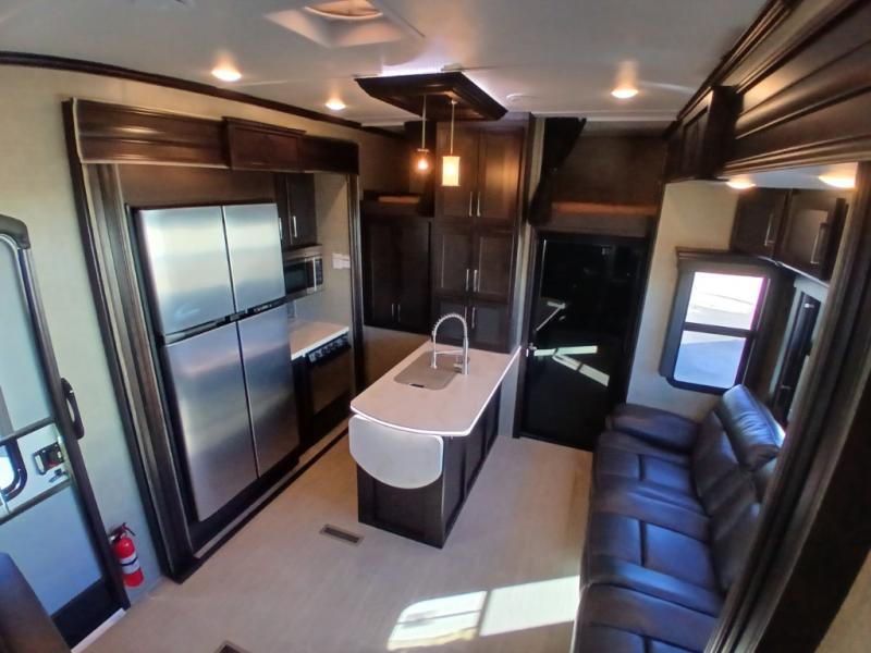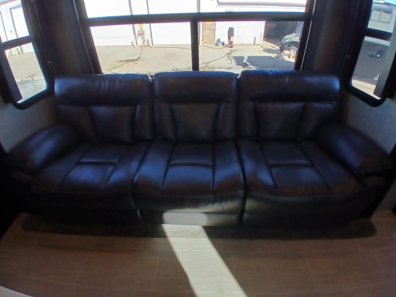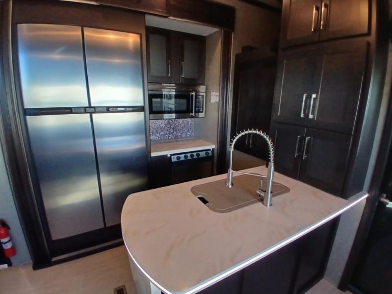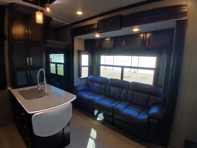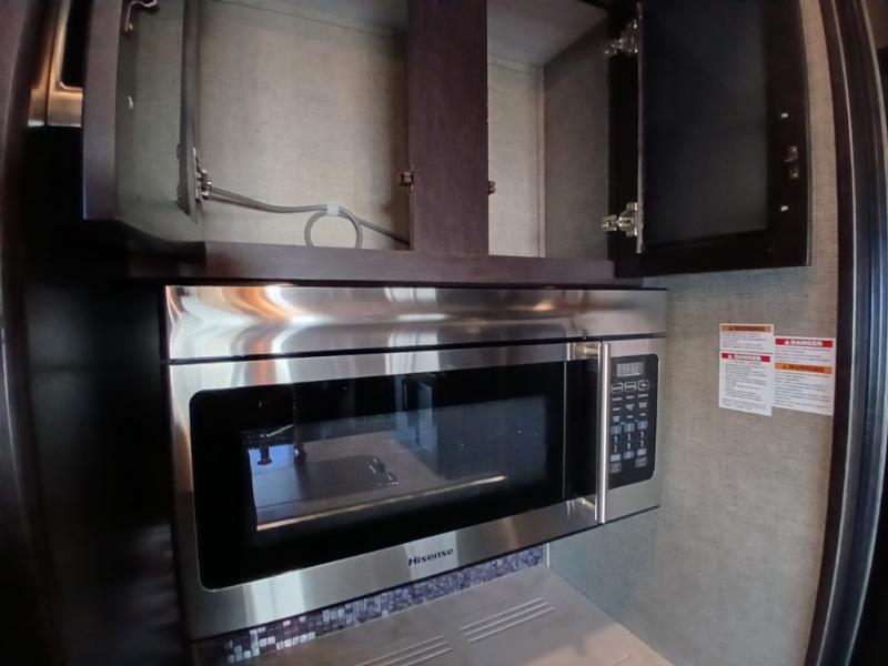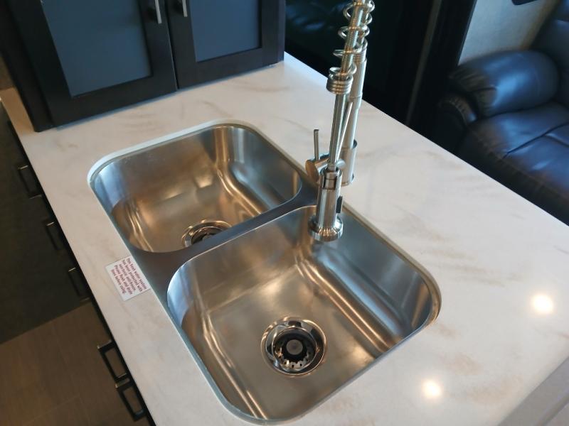 Head inside where you will find a slide out 97" sofa with recliners and a dinette table. You will also enjoy the natural light from the 72" window. There is a counter peninsula with double sink and counter extension, storage, a pantry, and a slide out three burner range, convection microwave, and 18 cu. ft. refrigerator on the opposite side. There is also an entertainment center along the interior wall with storage on one side, and stairs on the other side leading to the bathroom and front master suite.