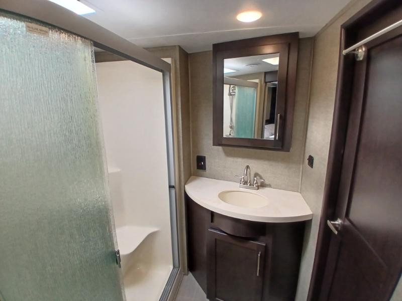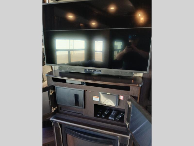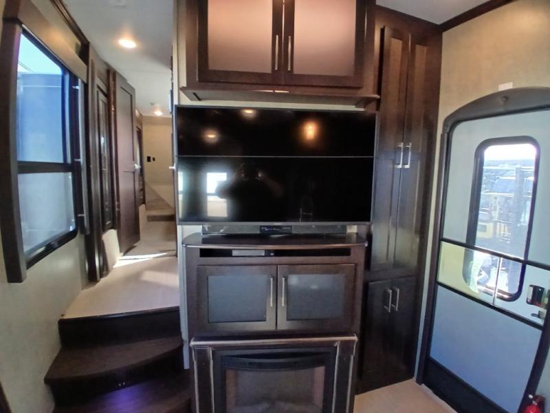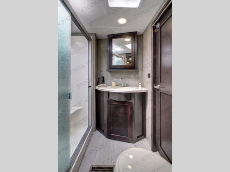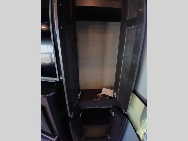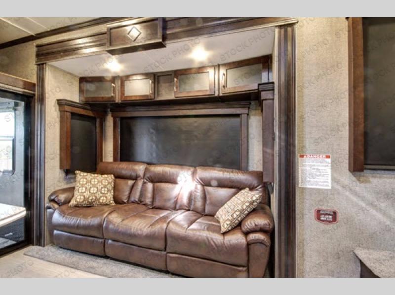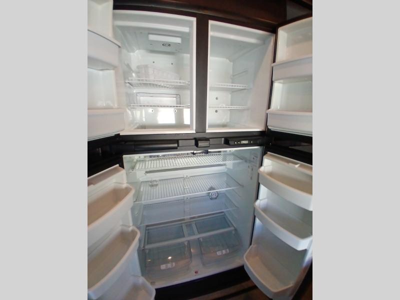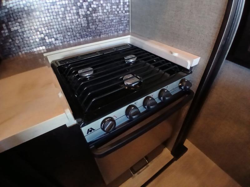 Head inside where you will find a slide out 97" sofa with recliners and a dinette table. You will also enjoy the natural light from the 72" window. There is a counter peninsula with double sink and counter extension, storage, a pantry, and a slide out three burner range, convection microwave, and 18 cu. ft. refrigerator on the opposite side. There is also an entertainment center along the interior wall with storage on one side, and stairs on the other side leading to the bathroom and front master suite.
