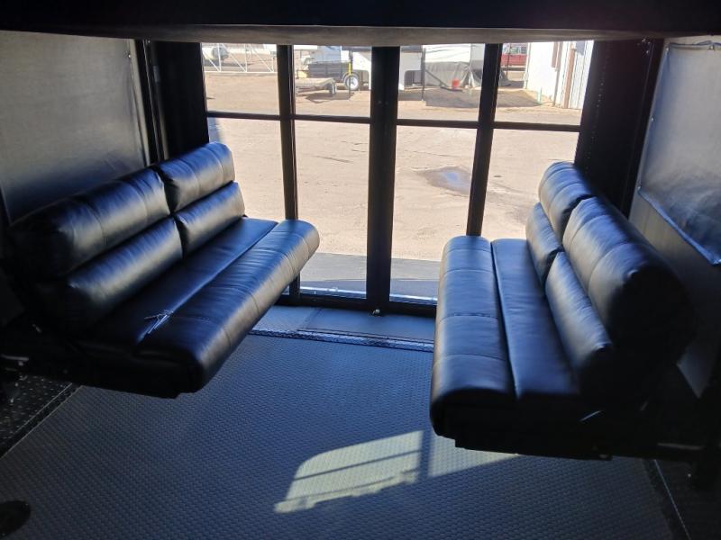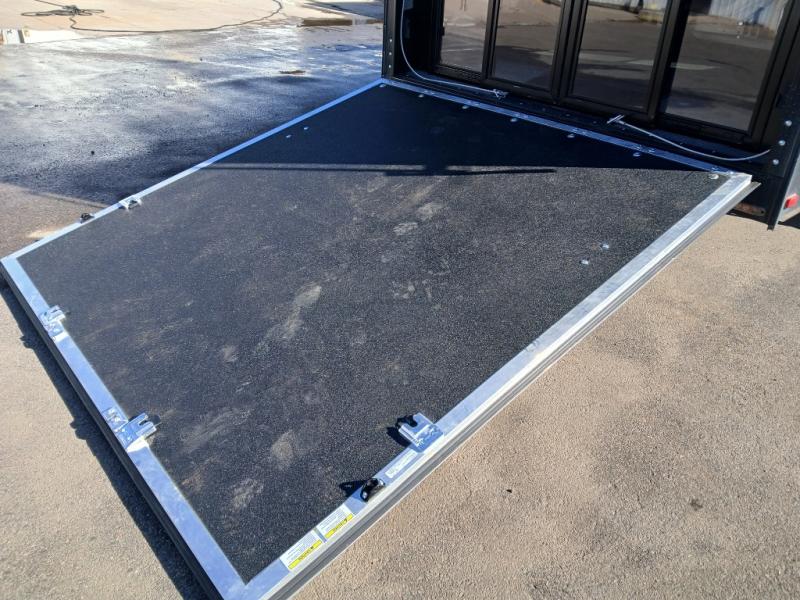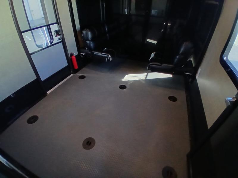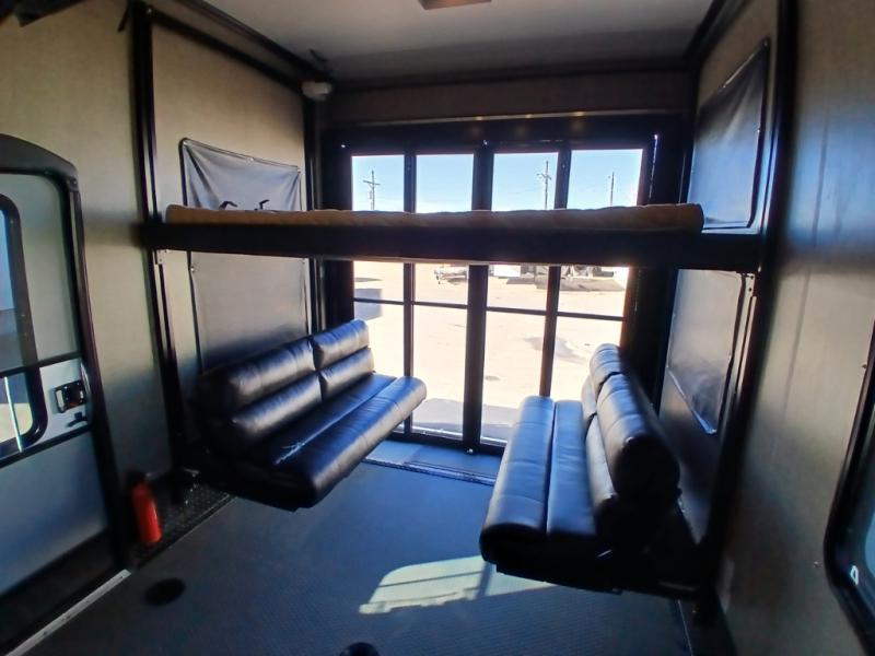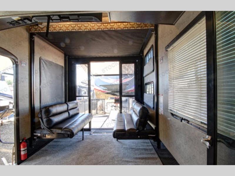 You can load and unload easily using the rear ramp door. Inside find plenty of space for parking your toys, a space for a washer and dryer if you choose to add, dual opposing sofas with an electric bed above, plus a twin size loft above in the front of the garage, and a side man door.