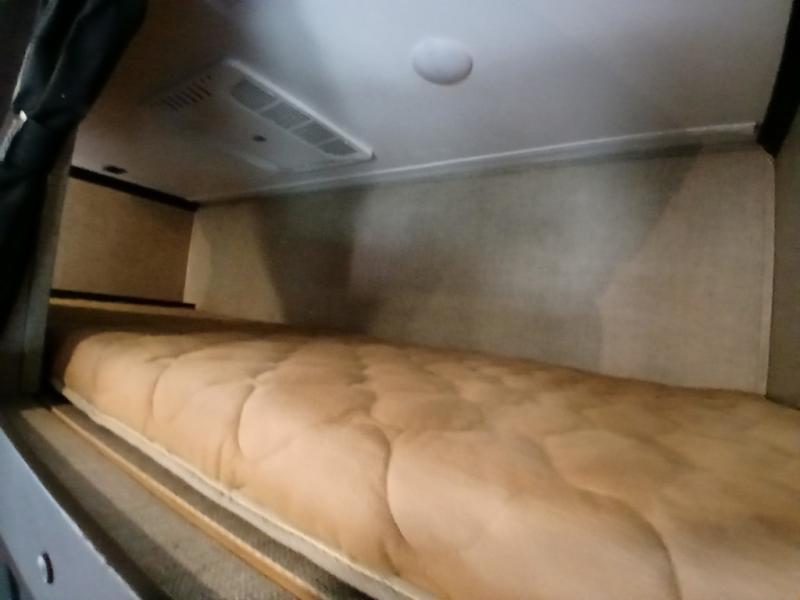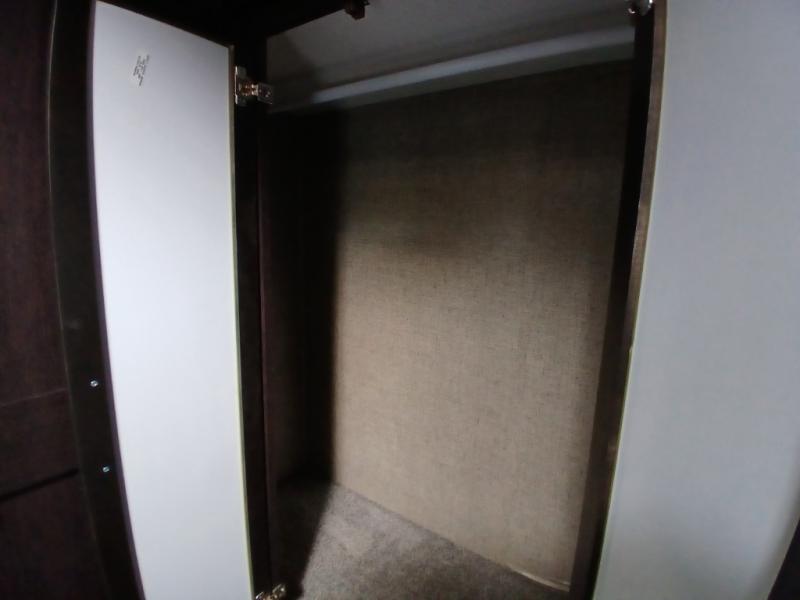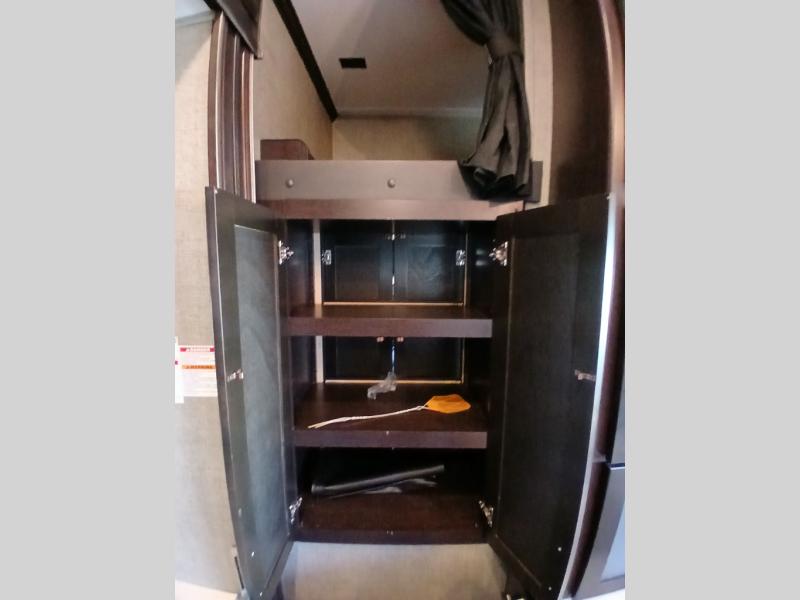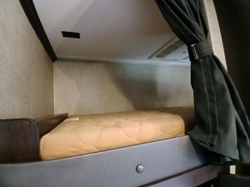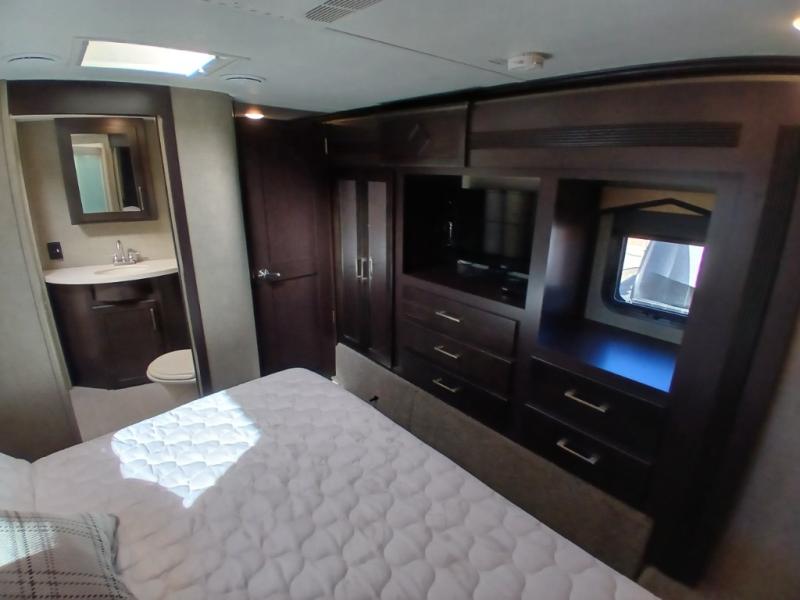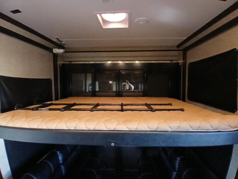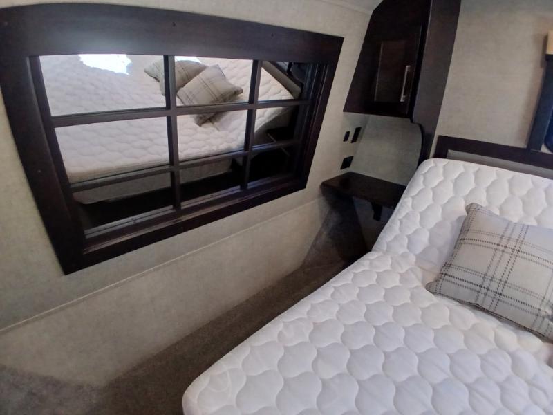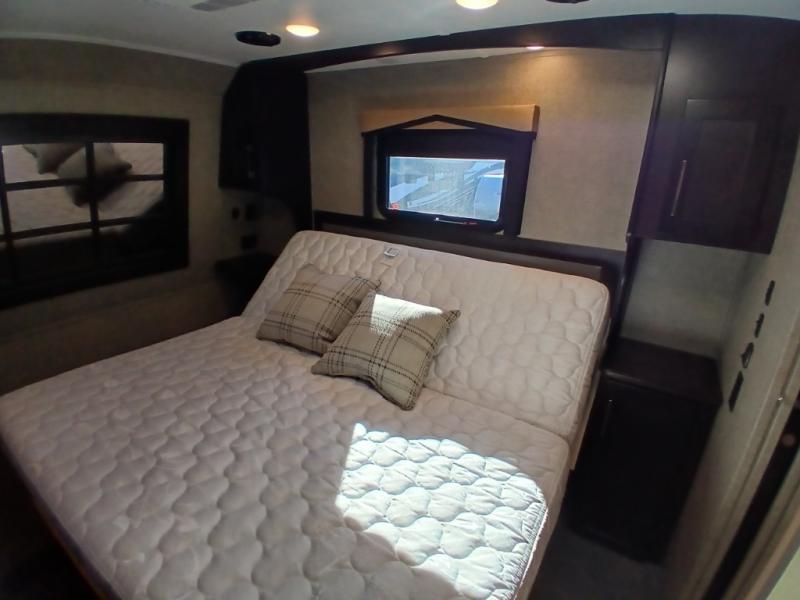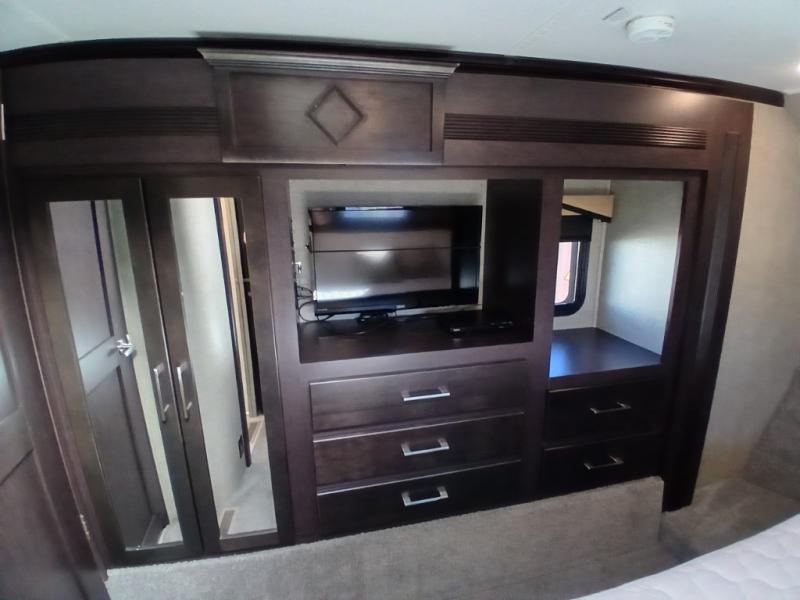The private front bedroom offers a spacious retreat including a slide out wardrobe, 32" TV, and dresser. You will also enjoy the king bed suite with nightstands and storage above.