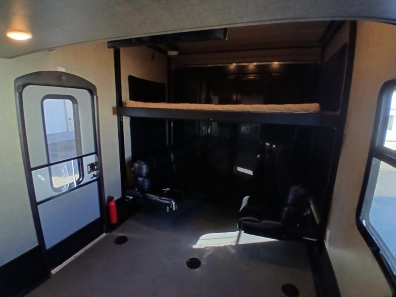 Take your fun up a notch camping in this Keystone Raptor fifth wheel toy hauler model 352TS featuring triple slides, a 12'6" garage with twin loft, and dual entry doors besides the rear ramp door.