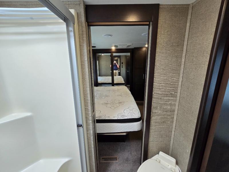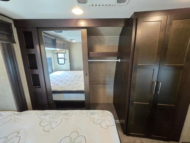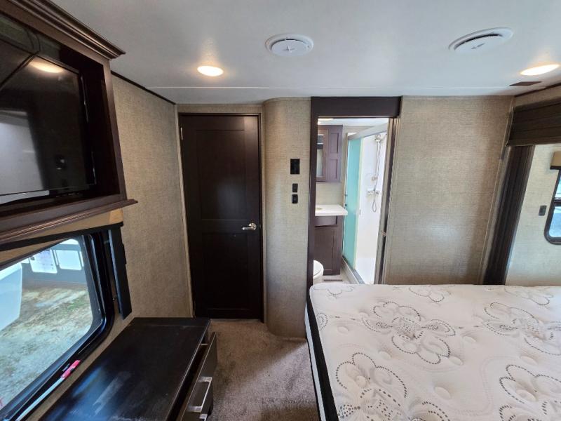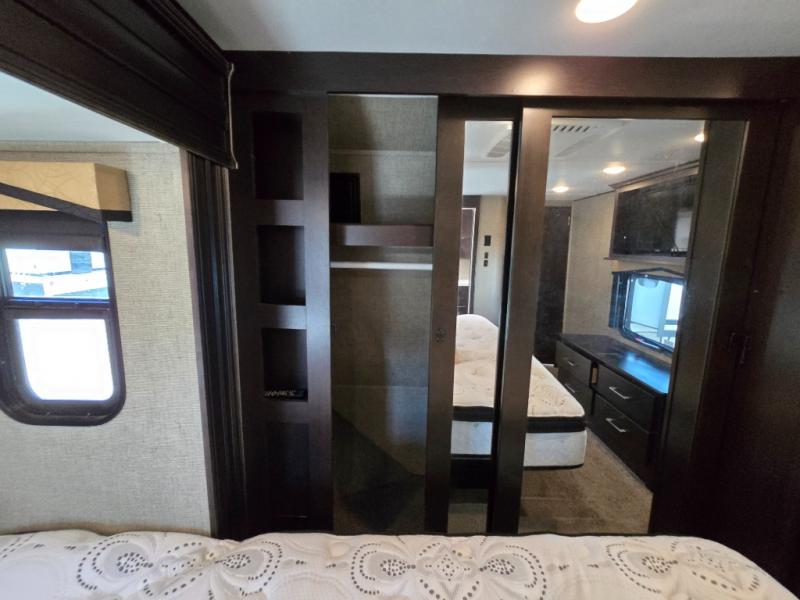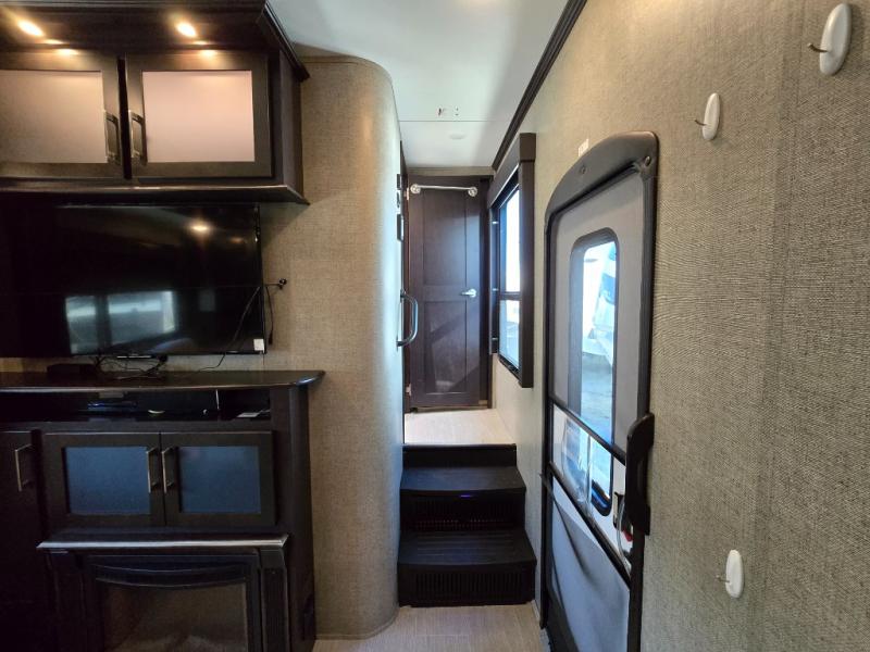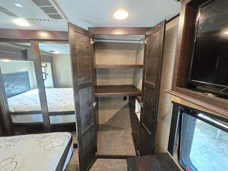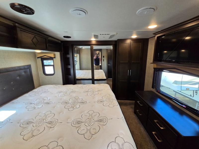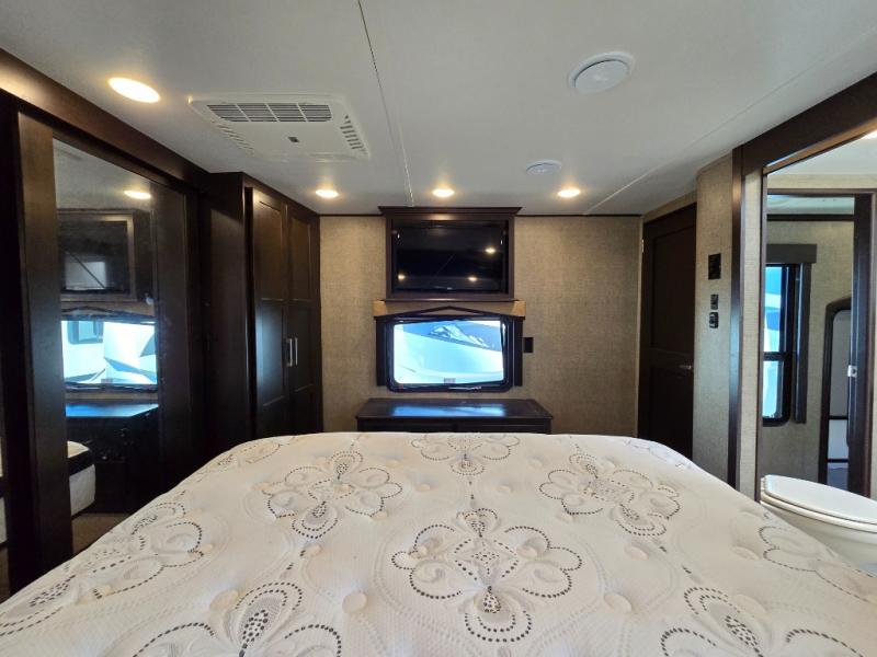 The front private master bedroom features a king bed suite slide, dresser opposite with entertainment center above, and a full front wardrobe with another wardrobe in the corner. You can even choose to add a washer and dryer if you like.