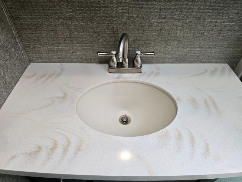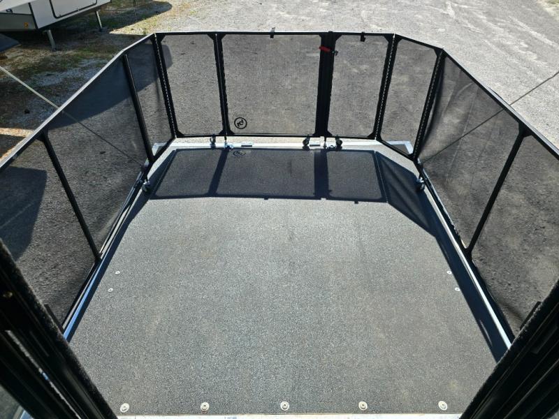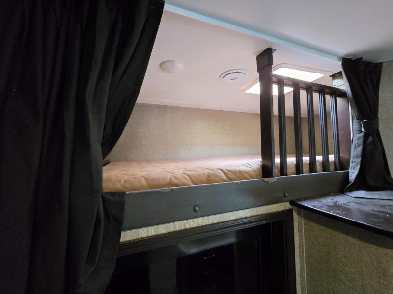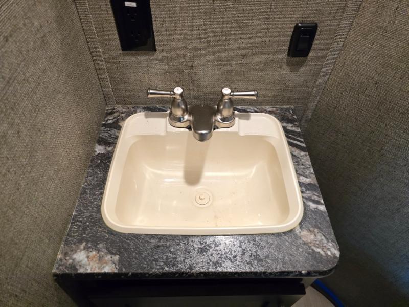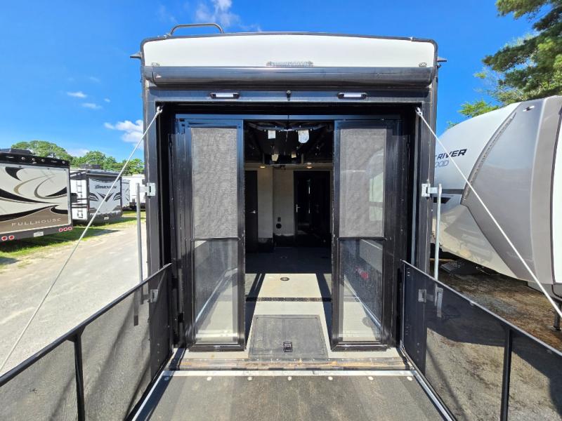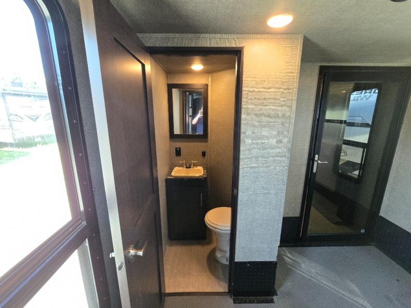 The 12' garage has room enough for a few toys, plus there is sleeping for nine with the electric bed with dual opposing sofas in the garage space. The ramp door makes loading and unloading easy, and there is overhead storage space for your gear. You will also find a twin bed loft above the garage area that overlooks the main living space inside. A nice half bath makes it easy to keep the dirt and grim outside where it belongs when they are coming in from playing on the trails to use a bathroom. Plus there is a side man door.