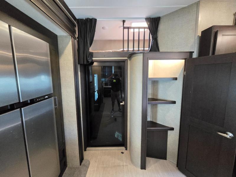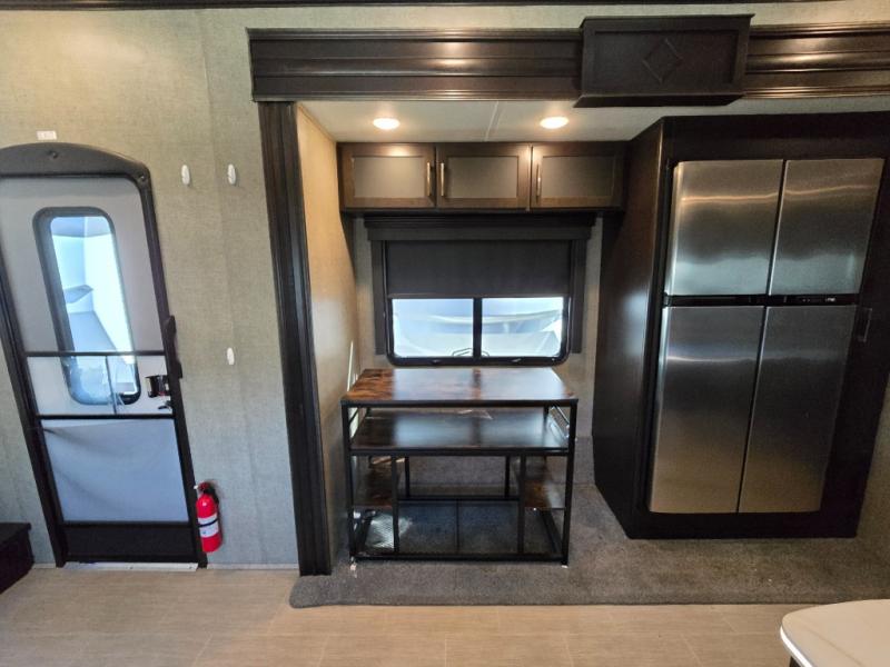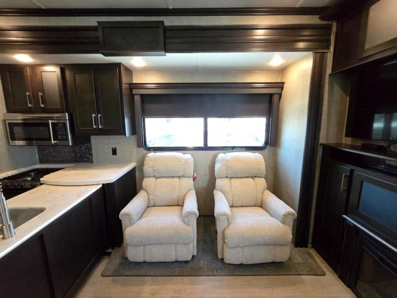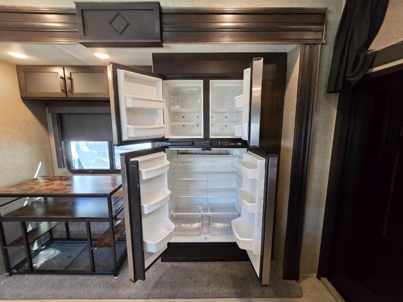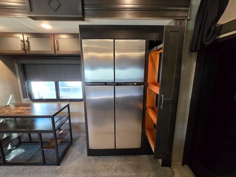 Inside the main living area find a wide open combined space with dual opposing slides. As you enter through the cargo area, there is a slide out double recliner and 18 cu. ft. refrigerator, plus pantry to the right along the curb side wall.