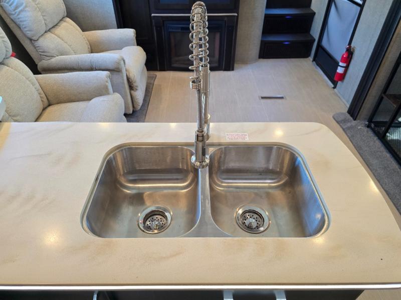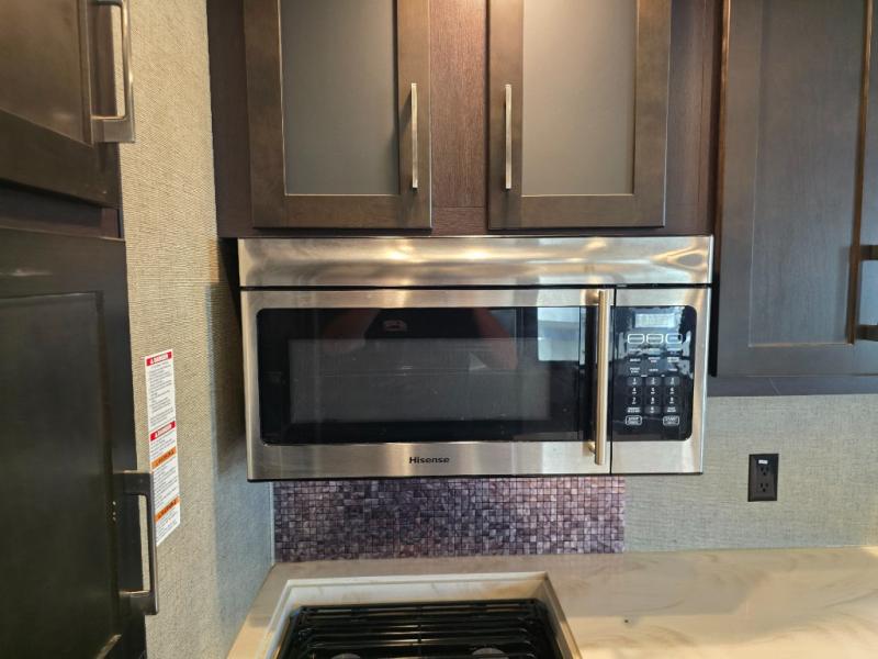 The opposite slide features an L-shaped hide-a-bed sofa with recliner on one end, and a kitchen area with three burner range, convection microwave, counter peninsula including double sinks, and overhead cabinets. A second pantry is on the interior wall for more dry goods. Next to the slide find an entertainment center on the outside wall of the full bath for your enjoyment.