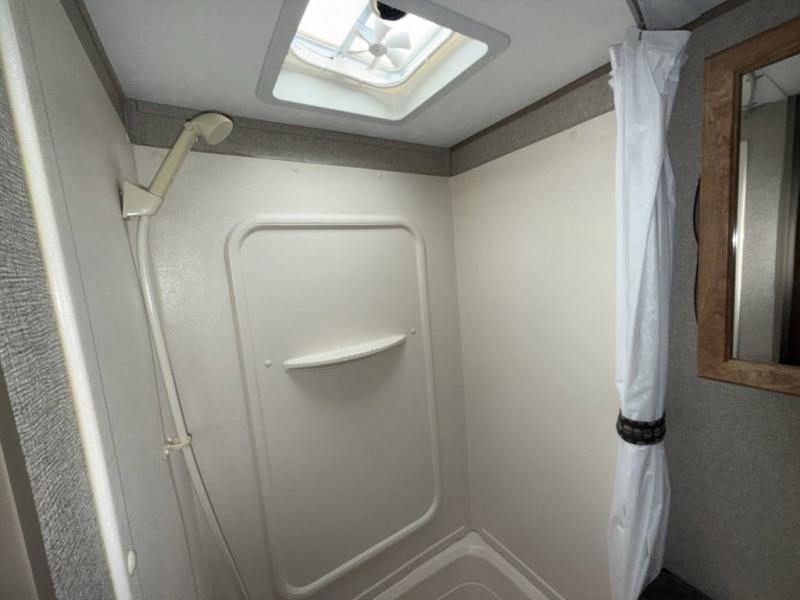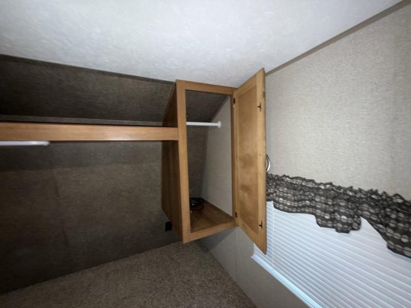 Enter to find a front spacious bedroom area that can be closed off with a curtain for a bit more privacy at night. There is a comfortable queen size bed, dual bedside closets, and overhead storage too.