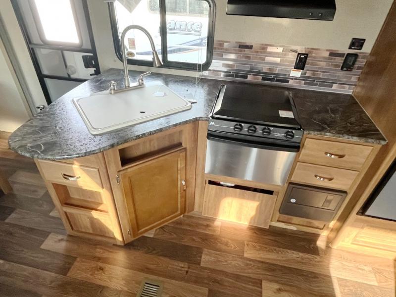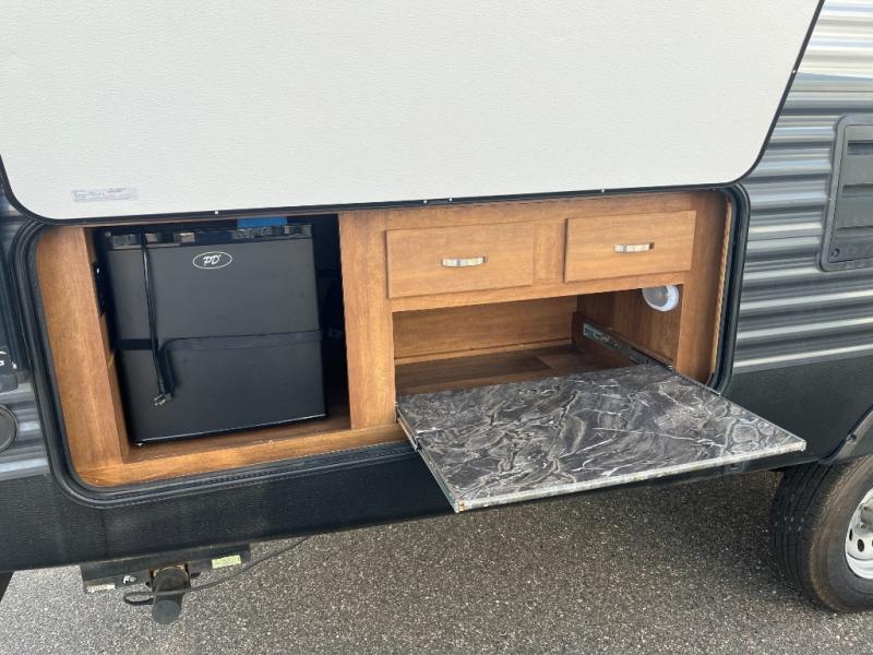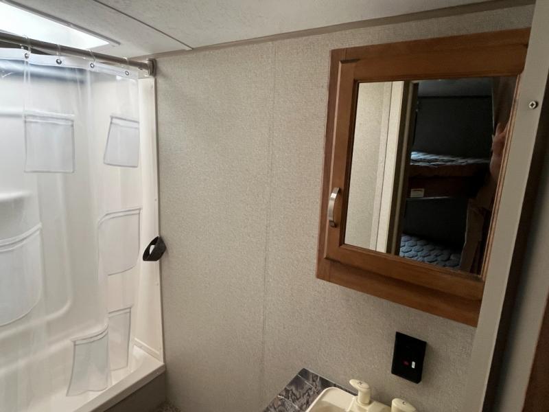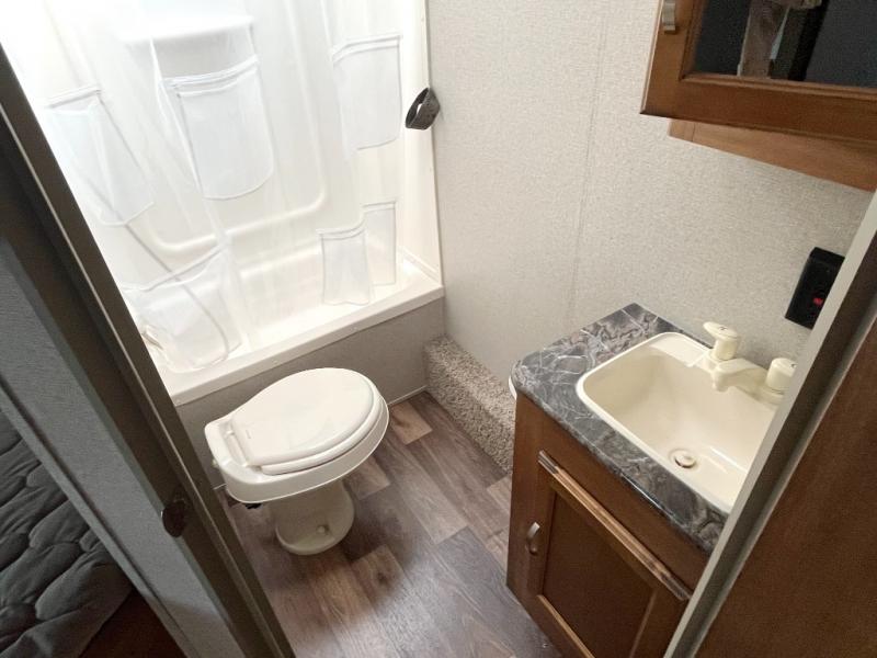 The slide out u-shaped dinette opposite the door side features seating when inside, plus you can also create sleeping space if needed at night. Just off the slide there is a rear corner bath that will certainly keep all of your campers clean and feeling fresh. Here you will enjoy a tub/shower, toilet, and vanity with sink.