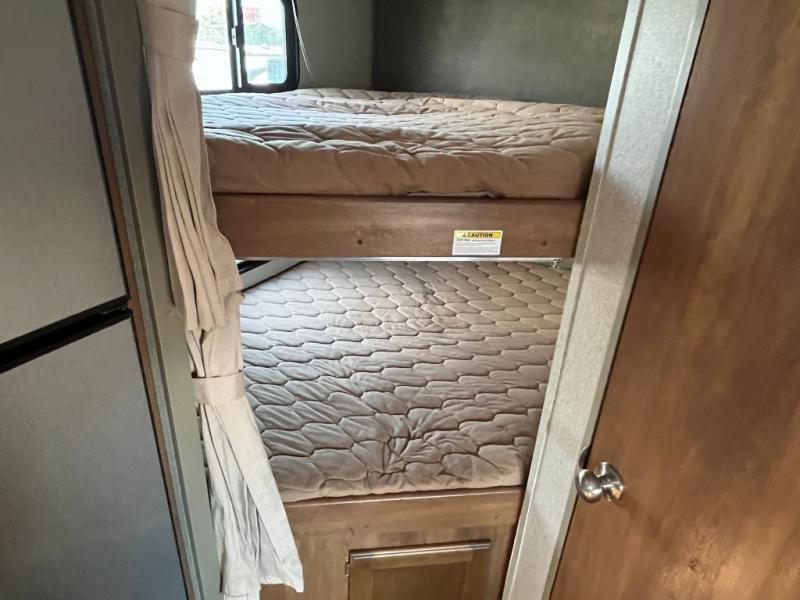 The rear left corner features a set of double size bunk beds that can accommodate four sleeping adults or children easily in this space.